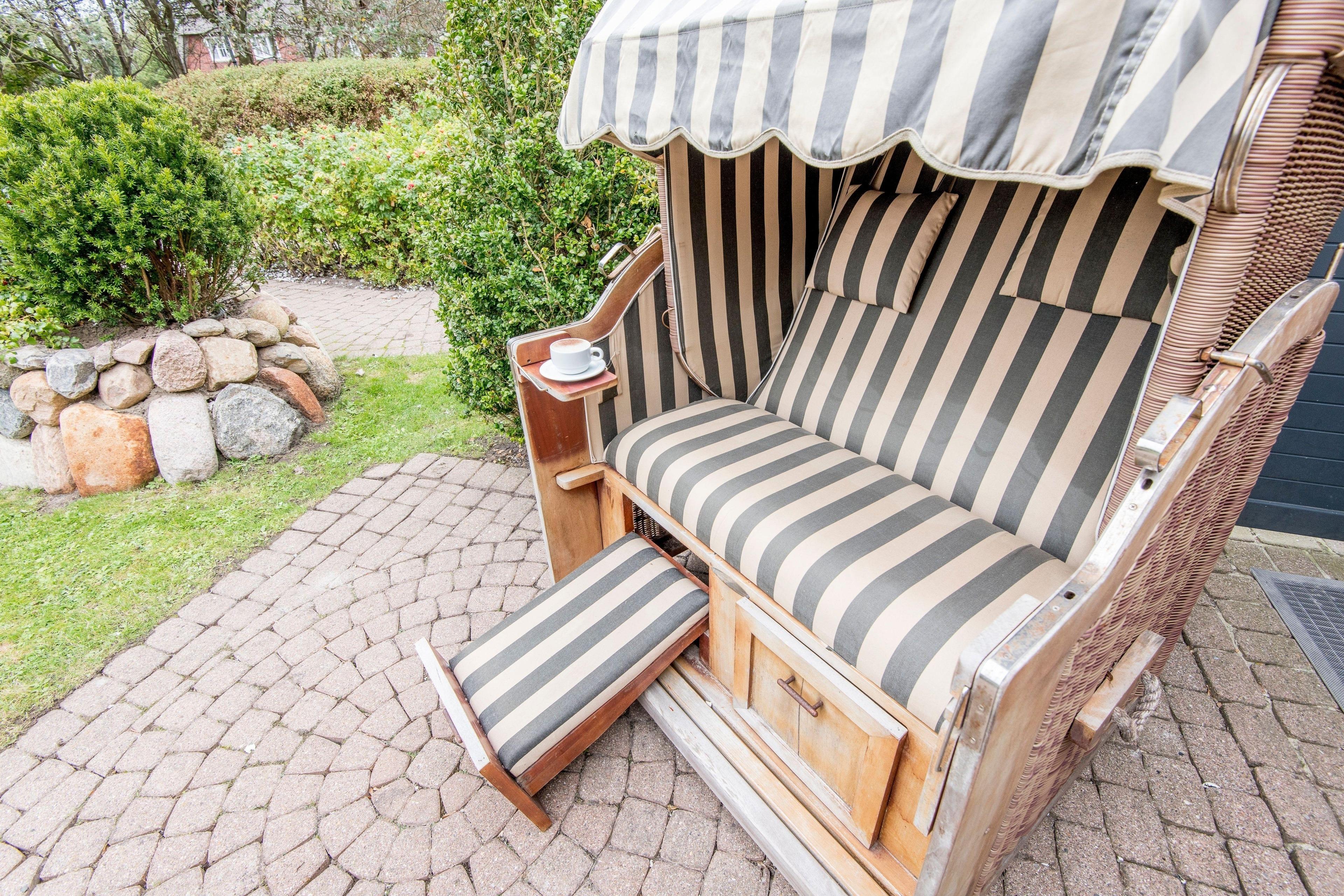 Sehr schöner eigener und sonniger Garten mit Garteneingang, Friesenwällen und Sylt-Rosen, schönem Strandkorb und edlen Gartenmöbeln.