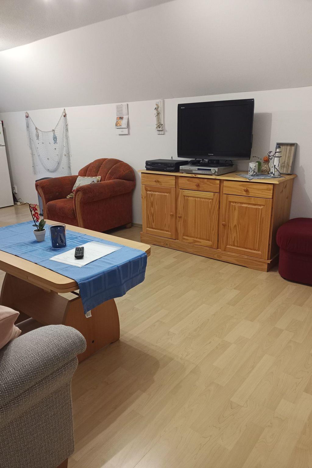 The 60 m² living space is divided into a bedroom with a double bed and an open-plan living area with dining table and kitchenette. There is also a shower room with WC and wash hand basin. The spacious bedroom offers enough space for an extra bed for a child. Use the TV with digital TV in the lounge for cosy evenings in the seating area with a couch and an armchair. The fully-equipped kitchen has a fridge with freezer compartment, induction hob and small electrical appliances such as a coffee machine, toaster and kettle, providing you with everything you need for convenient self-catering.