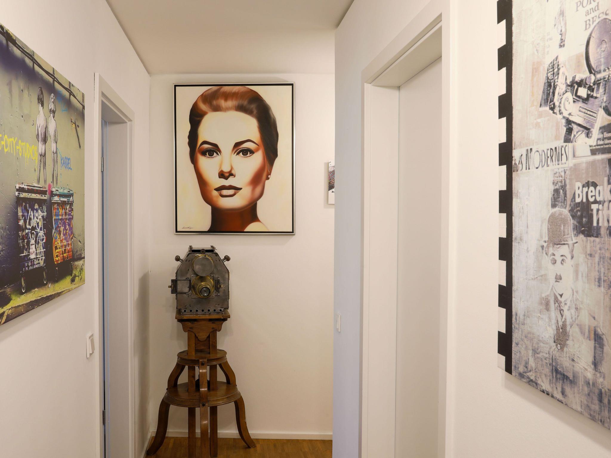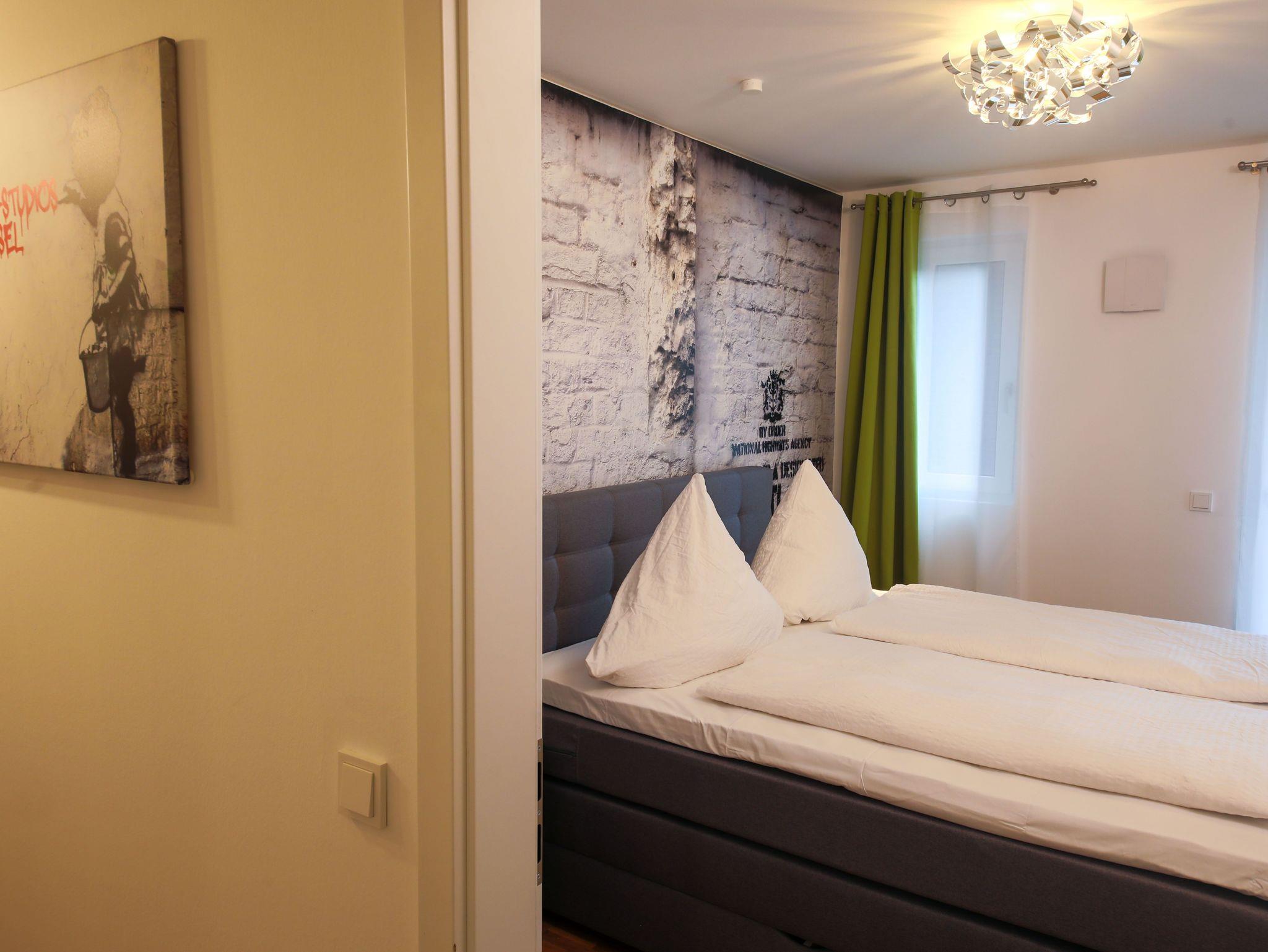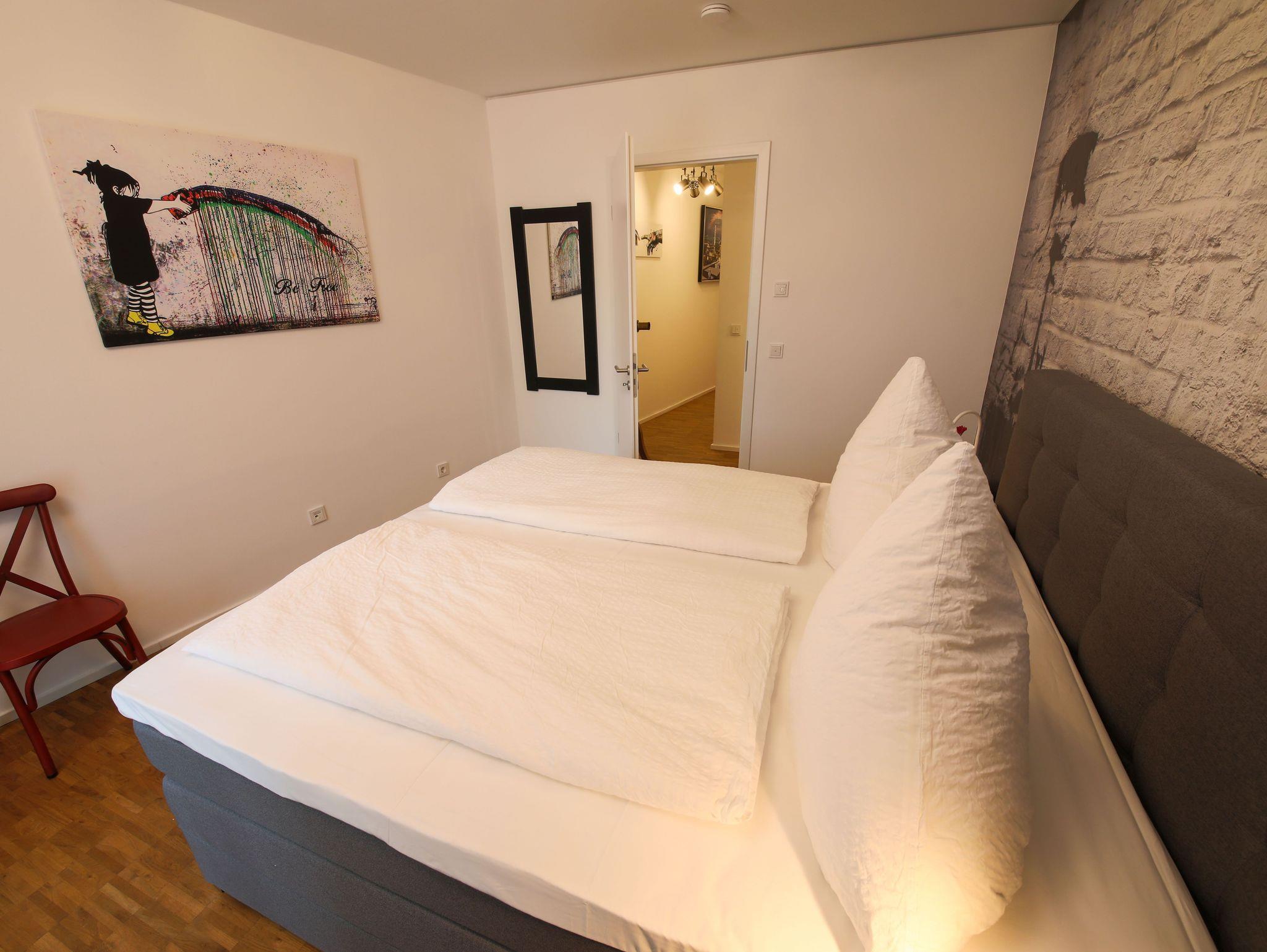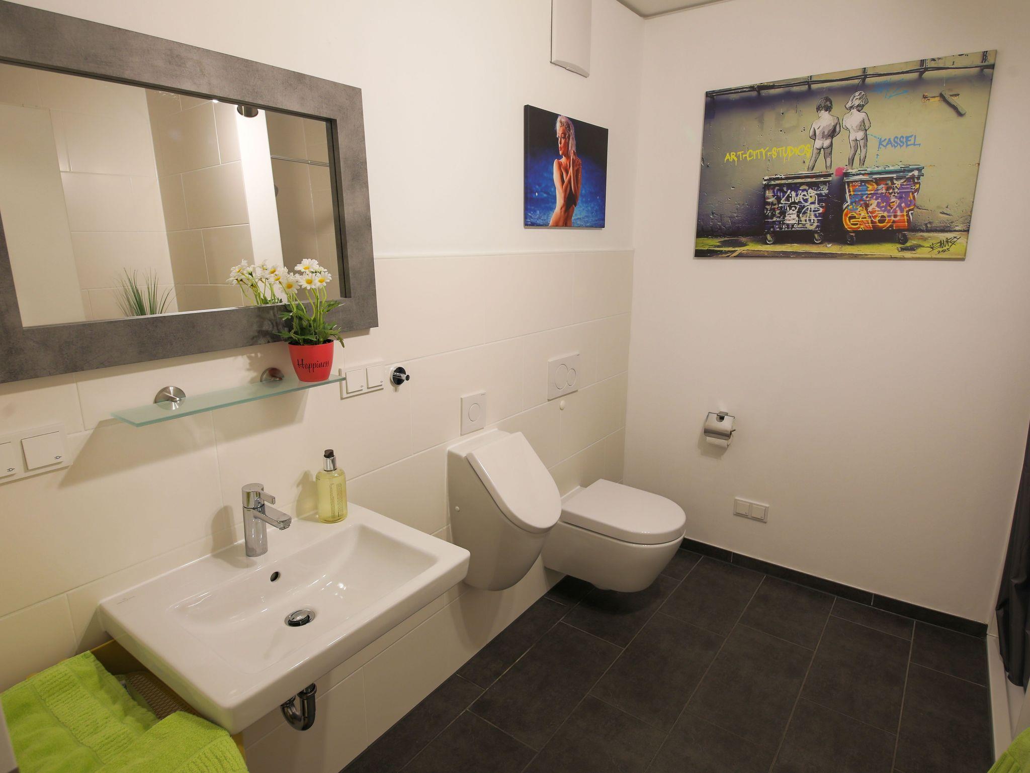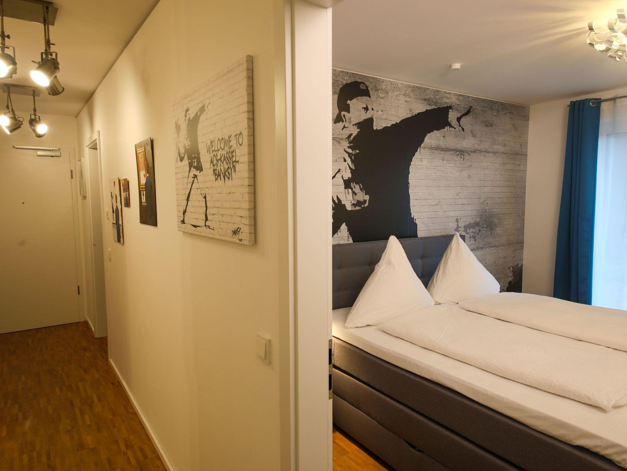 Die hochwertig eingerichtete Wohnung im Loft-Stil ist frisch renoviert und bietet Ihnen u.a. neben zahlreichen Kunstwerken des bekannten Street-Art-Künstlers Banksy ein großes Wohnzimmer mit Esstisch, TV und einem bequemen Schlafsofa sowie 3 geräumige, ruhige Schlafzimmer, die alle einen direkten Zugang zur großen und sonnigen Terrasse haben. Die Schlafzimmer sind mit großen Boxspring-Doppelbetten, Kleiderschränken und einem Schreibtisch ausgestattet. Außerdem besticht das exklusive Apartment mit einer komplett eingerichteten Küche (u.a. mit Geschirrspüler, Backofen, Mikrowelle, Ceranfeld, Kühl- und Gefrierschrank) und hat ein geräumiges modernes Bad mit Badewanne, extra Dusche, WC und Urinal sowie ein separates Gäste-WC mit Urinal. Die Wohnung verfügt zudem über eine Waschmaschine und hat einen großen, überdachten Balkon und eine große, sonnigen Terrasse zur Fulda hin. Außerdem bieten wir unseren Gästen einen kostenfreien PKW-Stellplatz im Haus.