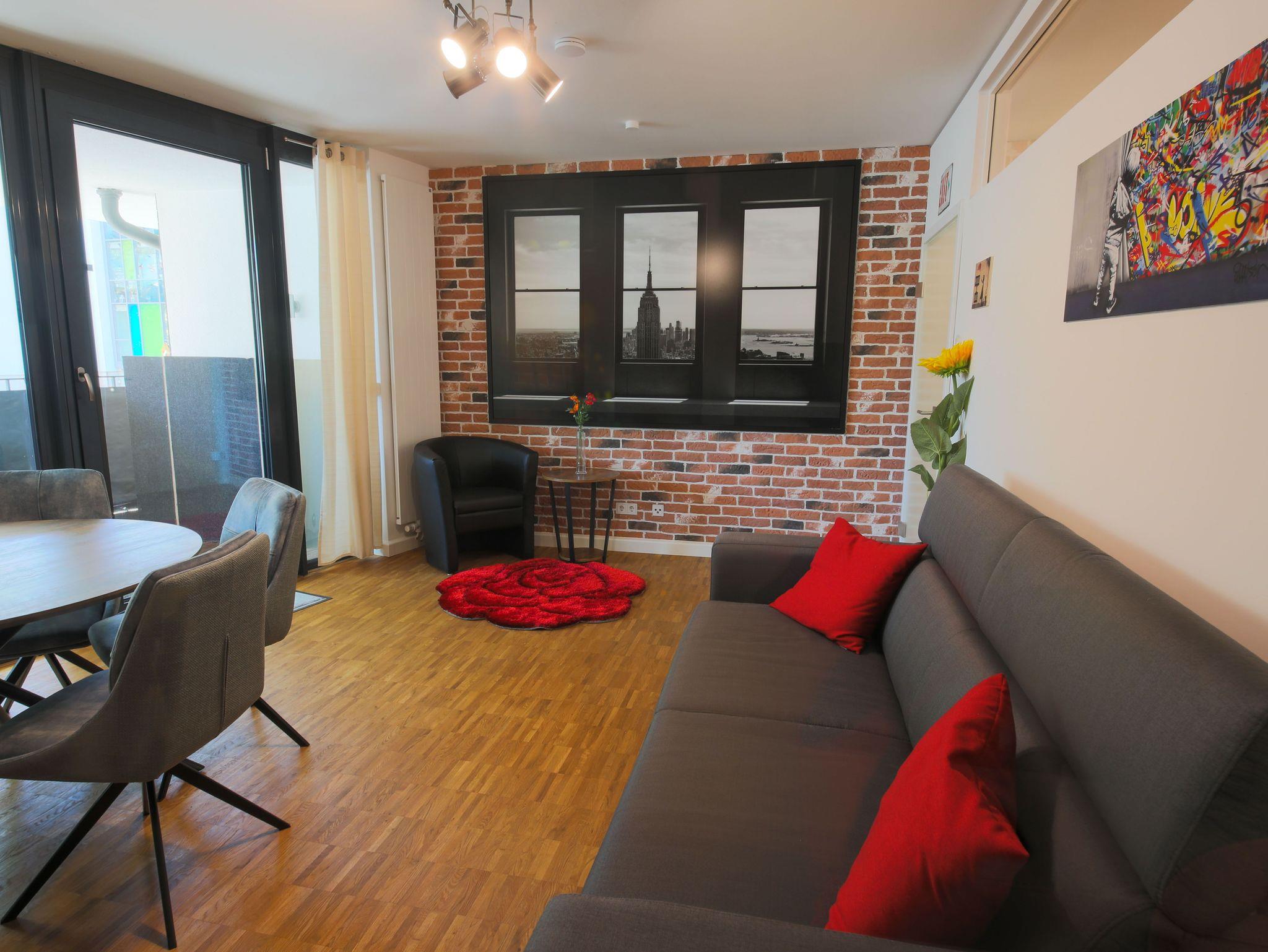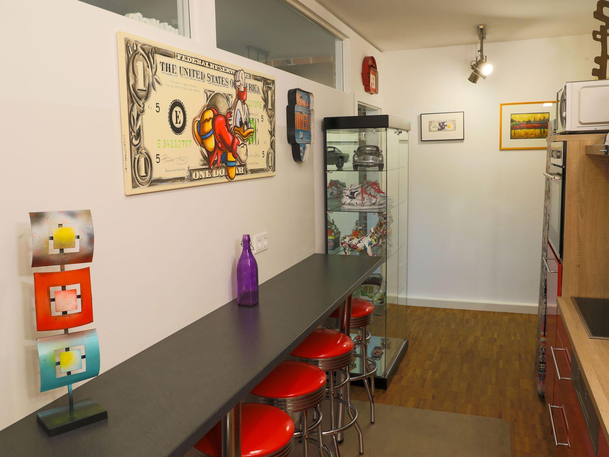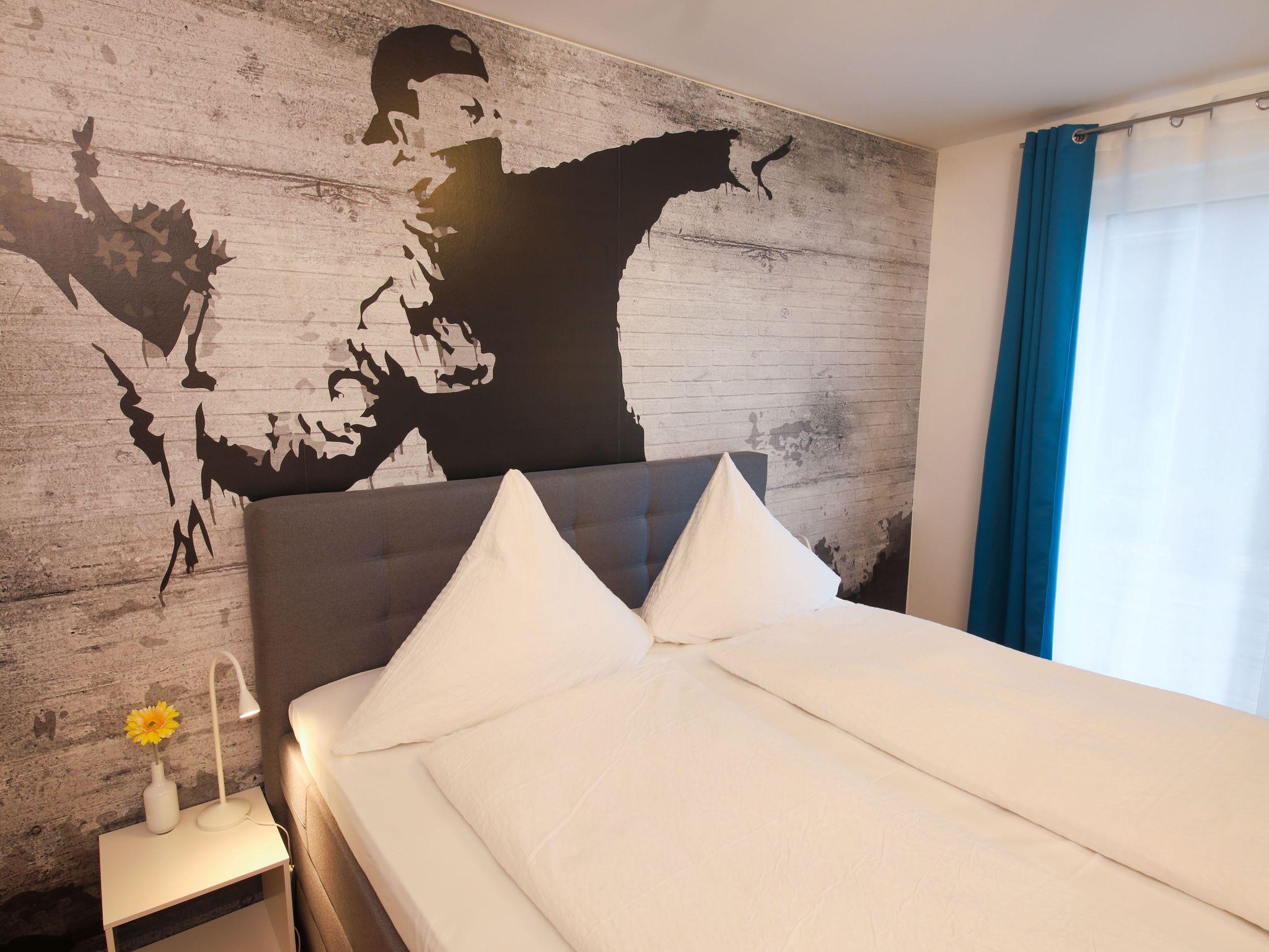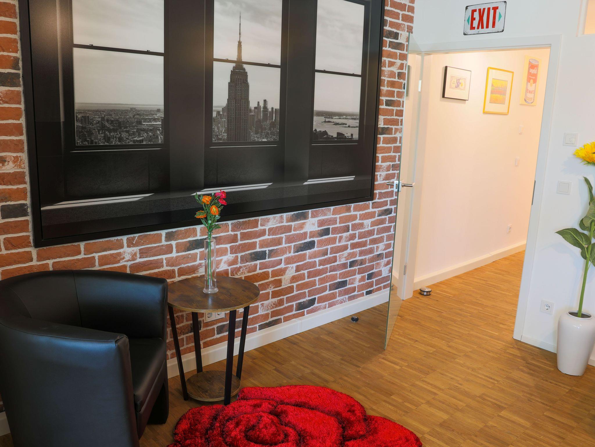 Die hochwertig eingerichtete Wohnung im Loft-Stil ist frisch renoviert und bietet Ihnen u.a. neben zahlreichen Kunstwerken des bekannten Street-Art-Künstlers Banksy ein großes Wohnzimmer mit Esstisch, TV und einem bequemen Schlafsofa sowie 3 geräumige, ruhige Schlafzimmer, die alle einen direkten Zugang zur großen und sonnigen Terrasse haben. Die Schlafzimmer sind mit großen Boxspring-Doppelbetten, Kleiderschränken und einem Schreibtisch ausgestattet. Außerdem besticht das exklusive Apartment mit einer komplett eingerichteten Küche (u.a. mit Geschirrspüler, Backofen, Mikrowelle, Ceranfeld, Kühl- und Gefrierschrank) und hat ein geräumiges modernes Bad mit Badewanne, extra Dusche, WC und Urinal sowie ein separates Gäste-WC mit Urinal. Die Wohnung verfügt zudem über eine Waschmaschine und hat einen großen, überdachten Balkon und eine große, sonnigen Terrasse zur Fulda hin. Außerdem bieten wir unseren Gästen einen kostenfreien PKW-Stellplatz im Haus.