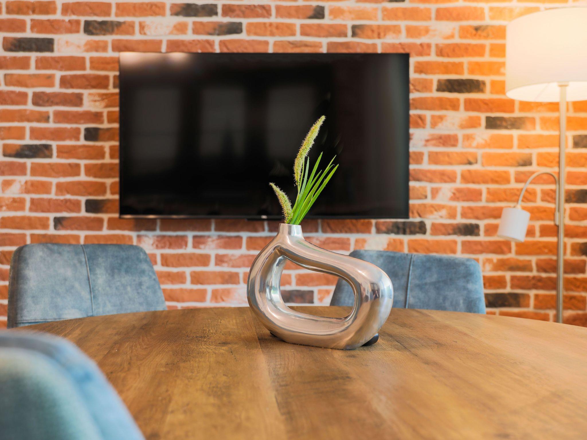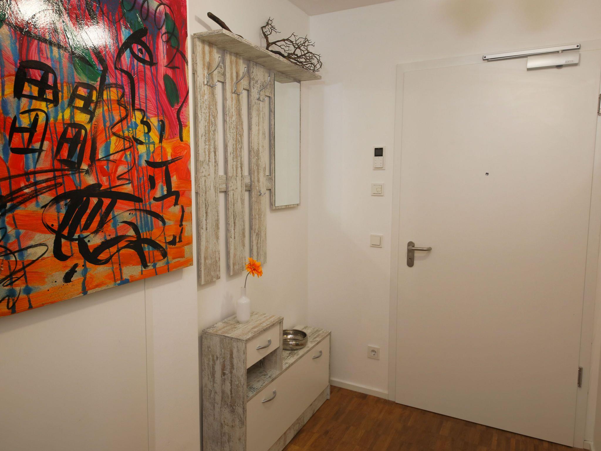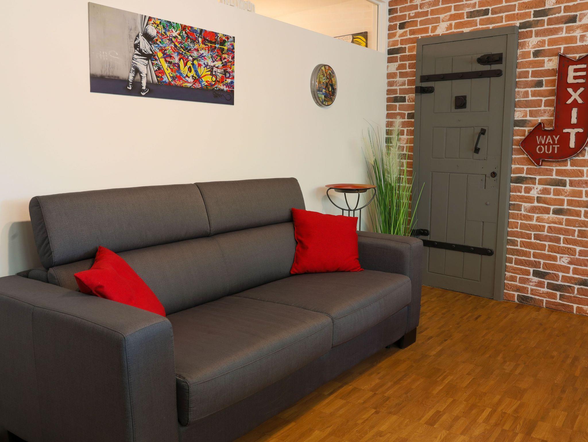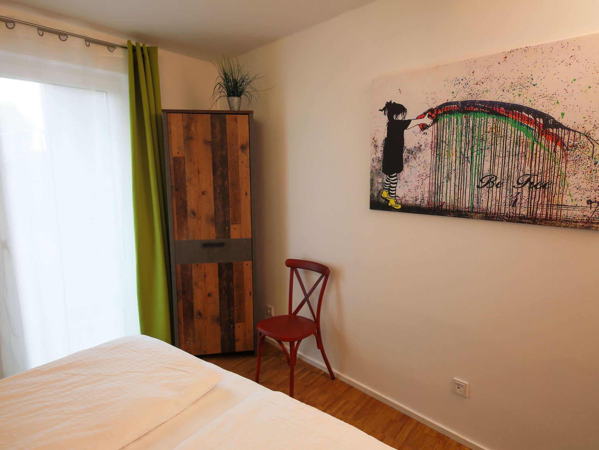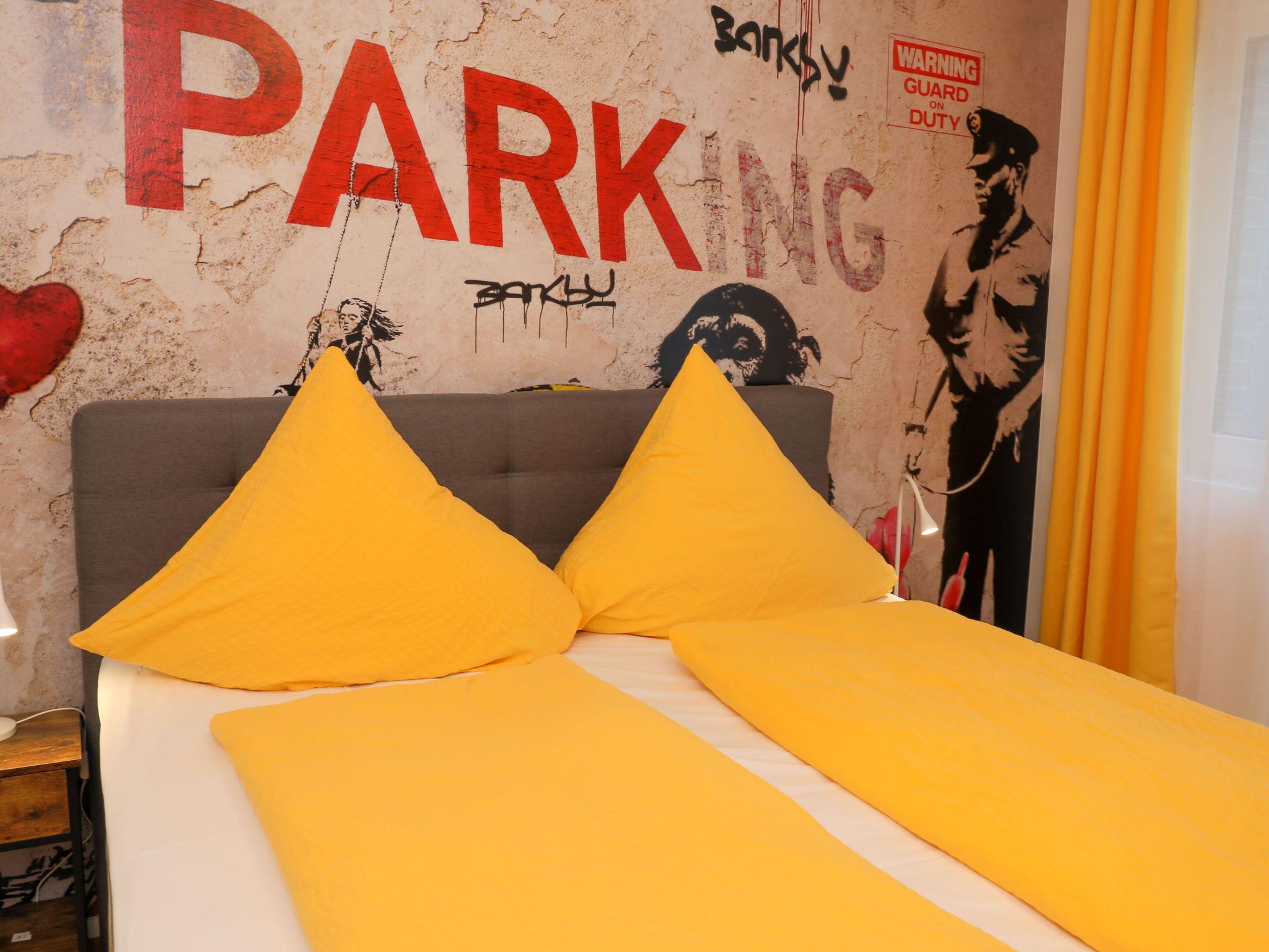 Die hochwertig eingerichtete Wohnung im Loft-Stil ist frisch renoviert und bietet Ihnen u.a. neben zahlreichen Kunstwerken des bekannten Street-Art-Künstlers Banksy ein großes Wohnzimmer mit Esstisch, TV und einem bequemen Schlafsofa sowie 3 geräumige, ruhige Schlafzimmer, die alle einen direkten Zugang zur großen und sonnigen Terrasse haben. Die Schlafzimmer sind mit großen Boxspring-Doppelbetten, Kleiderschränken und einem Schreibtisch ausgestattet. Außerdem besticht das exklusive Apartment mit einer komplett eingerichteten Küche (u.a. mit Geschirrspüler, Backofen, Mikrowelle, Ceranfeld, Kühl- und Gefrierschrank) und hat ein geräumiges modernes Bad mit Badewanne, extra Dusche, WC und Urinal sowie ein separates Gäste-WC mit Urinal. Die Wohnung verfügt zudem über eine Waschmaschine und hat einen großen, überdachten Balkon und eine große, sonnigen Terrasse zur Fulda hin. Außerdem bieten wir unseren Gästen einen kostenfreien PKW-Stellplatz im Haus.