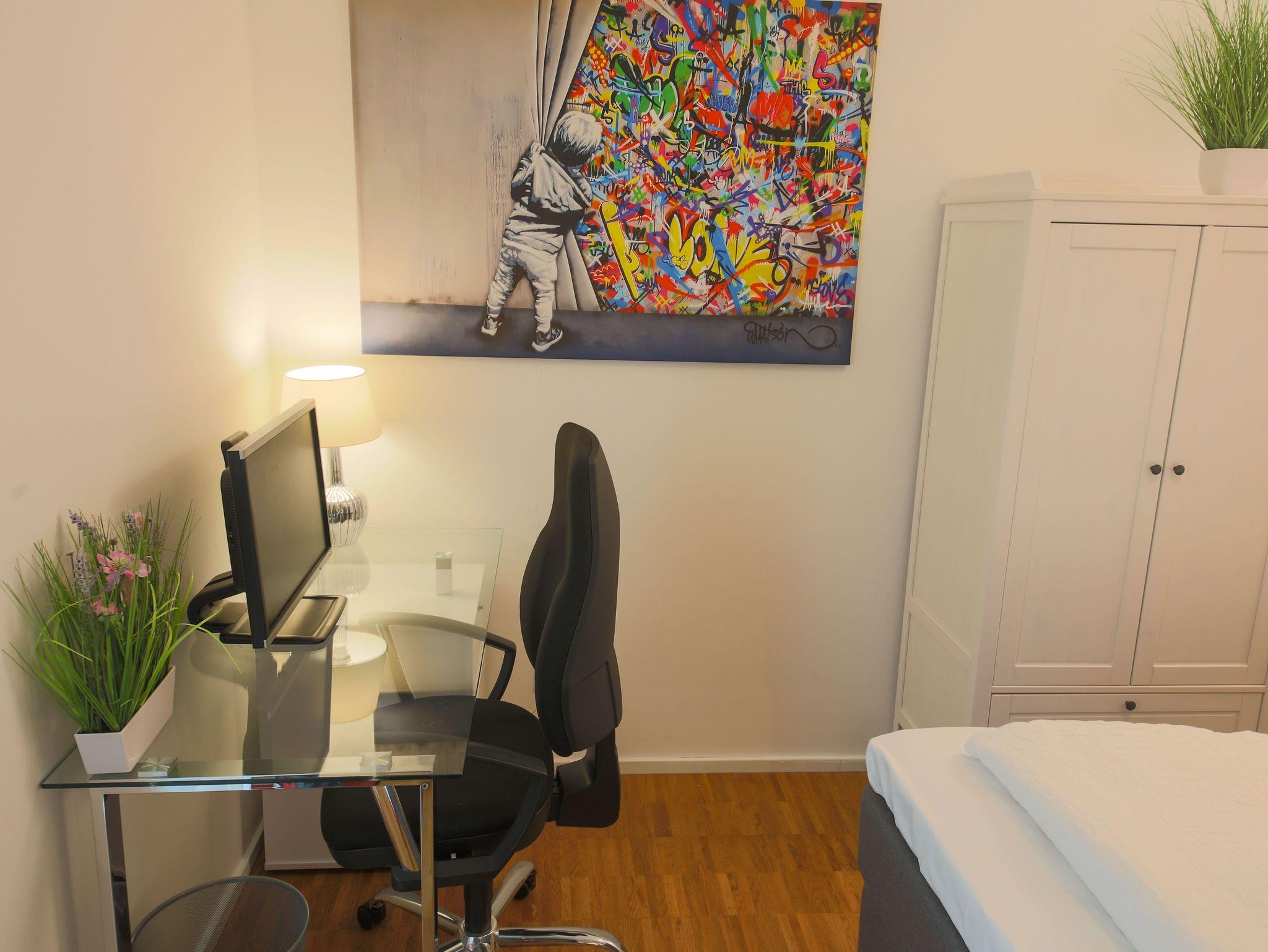 Kleiderschränken und einem Schreibtisch ausgestattet. Außerdem besticht das