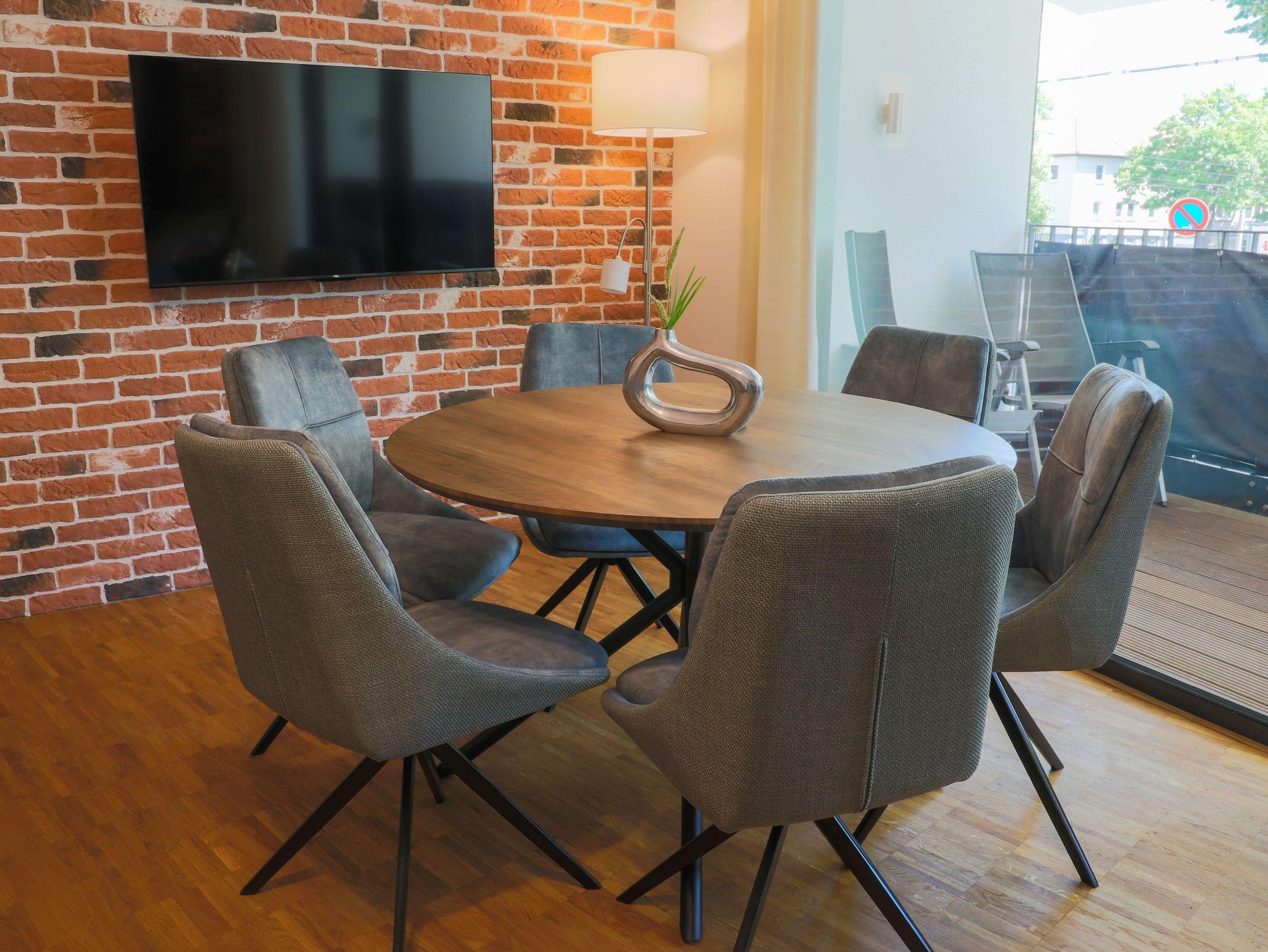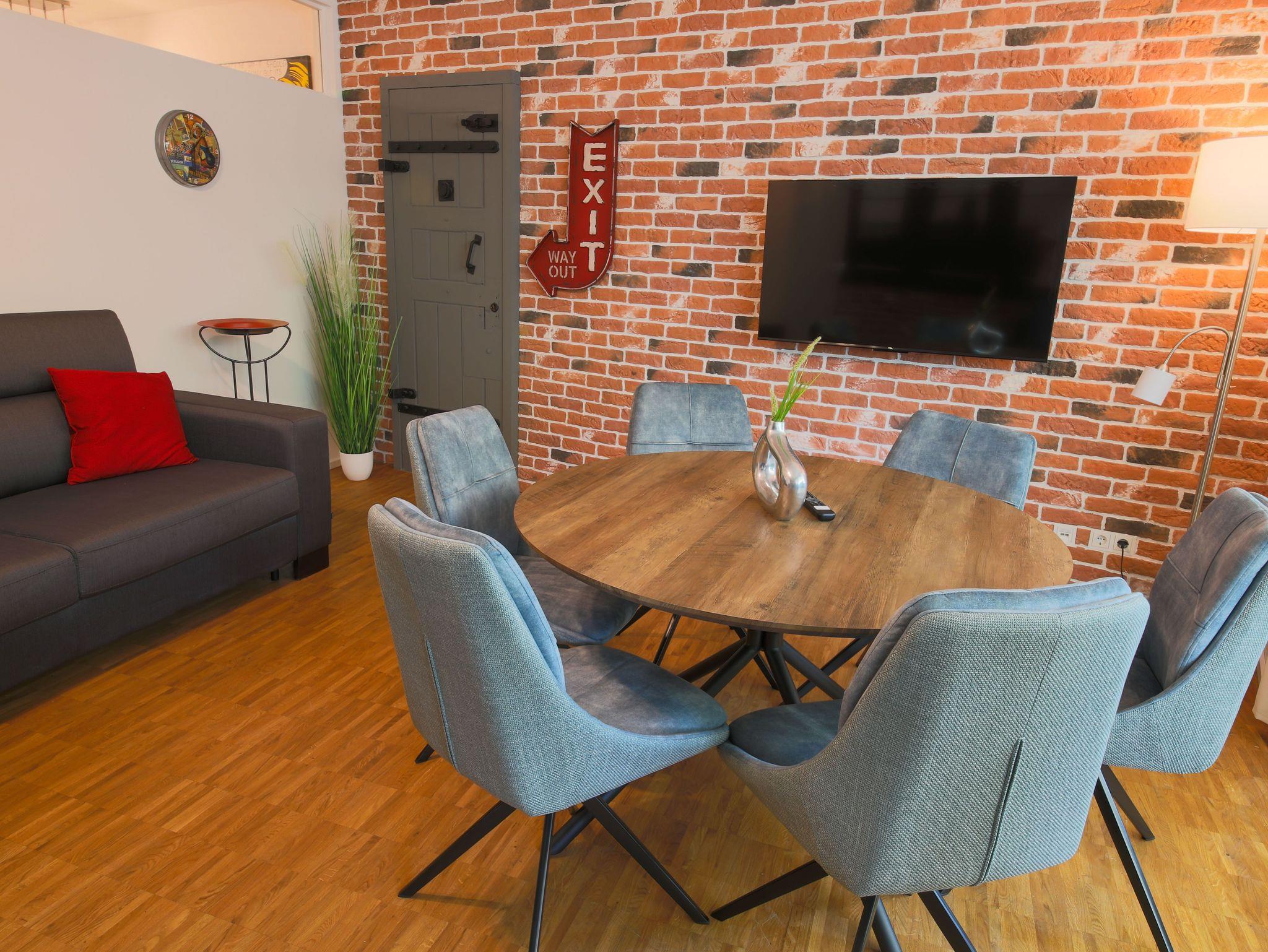 großes Wohnzimmer mit Esstisch, TV und einem bequemen Schlafsofa sowie 3