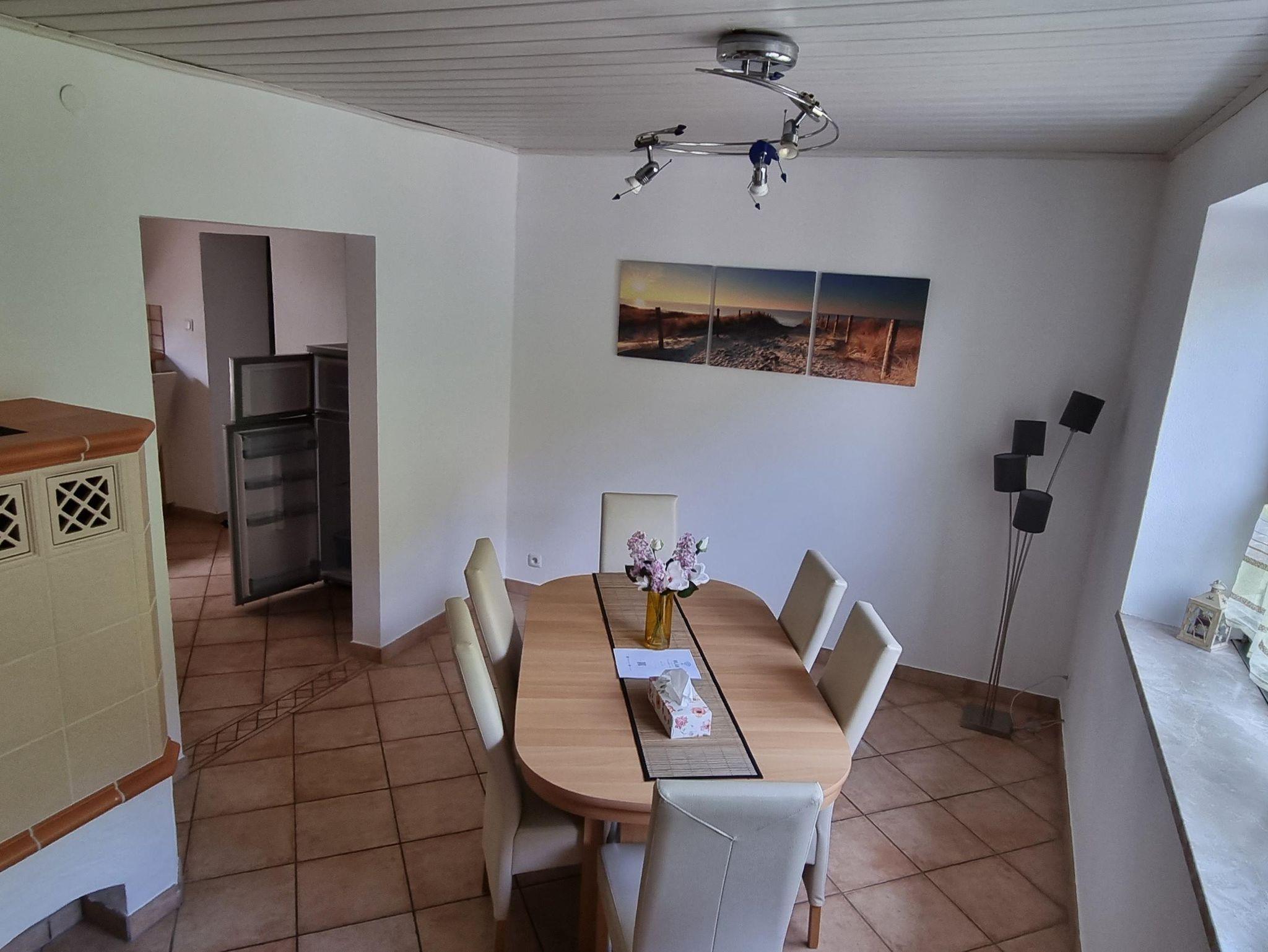 Das Ferienhaus hat zwei Etagen. Im Erdgeschoss befindet sich ein Schlafzimmer, eine Gästetoilette, ein Essbereich mit Kachelofen und eine Küche mit angrenzendem Abstellraum. Im ersten Stock befinden sich zwei weitere Schlafzimmer, ein großes Bad mit Dusche und Eckbadewanne, das Wohnzimmer und eine große Terrasse.