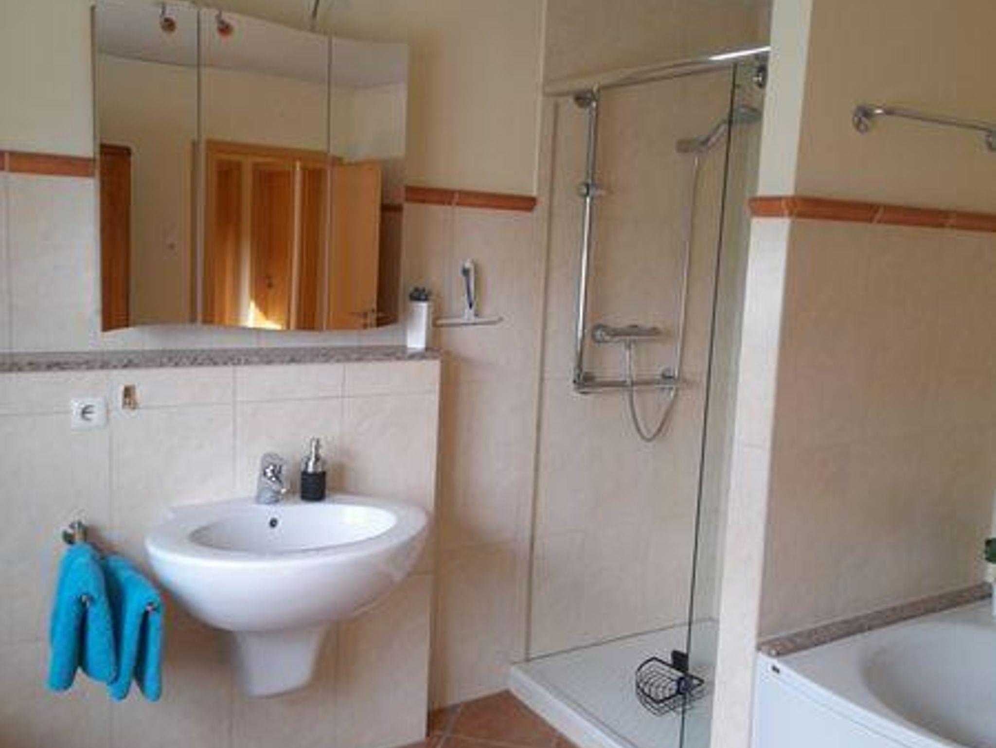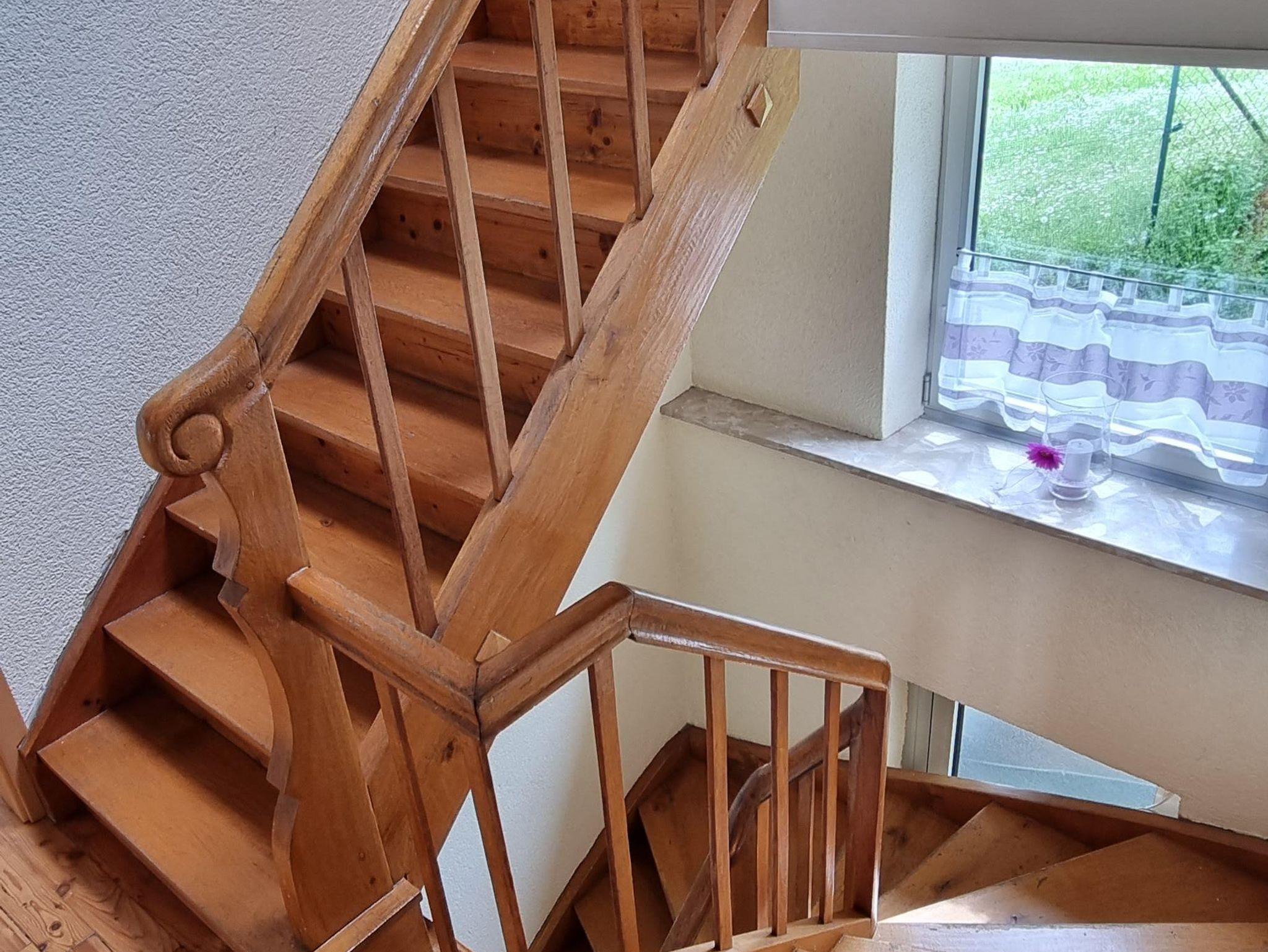 Das Ferienhaus hat zwei Etagen. Im Erdgeschoss befindet sich ein Schlafzimmer, eine Gästetoilette, ein Essbereich mit Kachelofen und eine Küche mit angrenzendem Abstellraum. Im ersten Stock befinden sich zwei weitere Schlafzimmer, ein großes Bad mit Dusche und Eckbadewanne, das Wohnzimmer und eine große Terrasse.