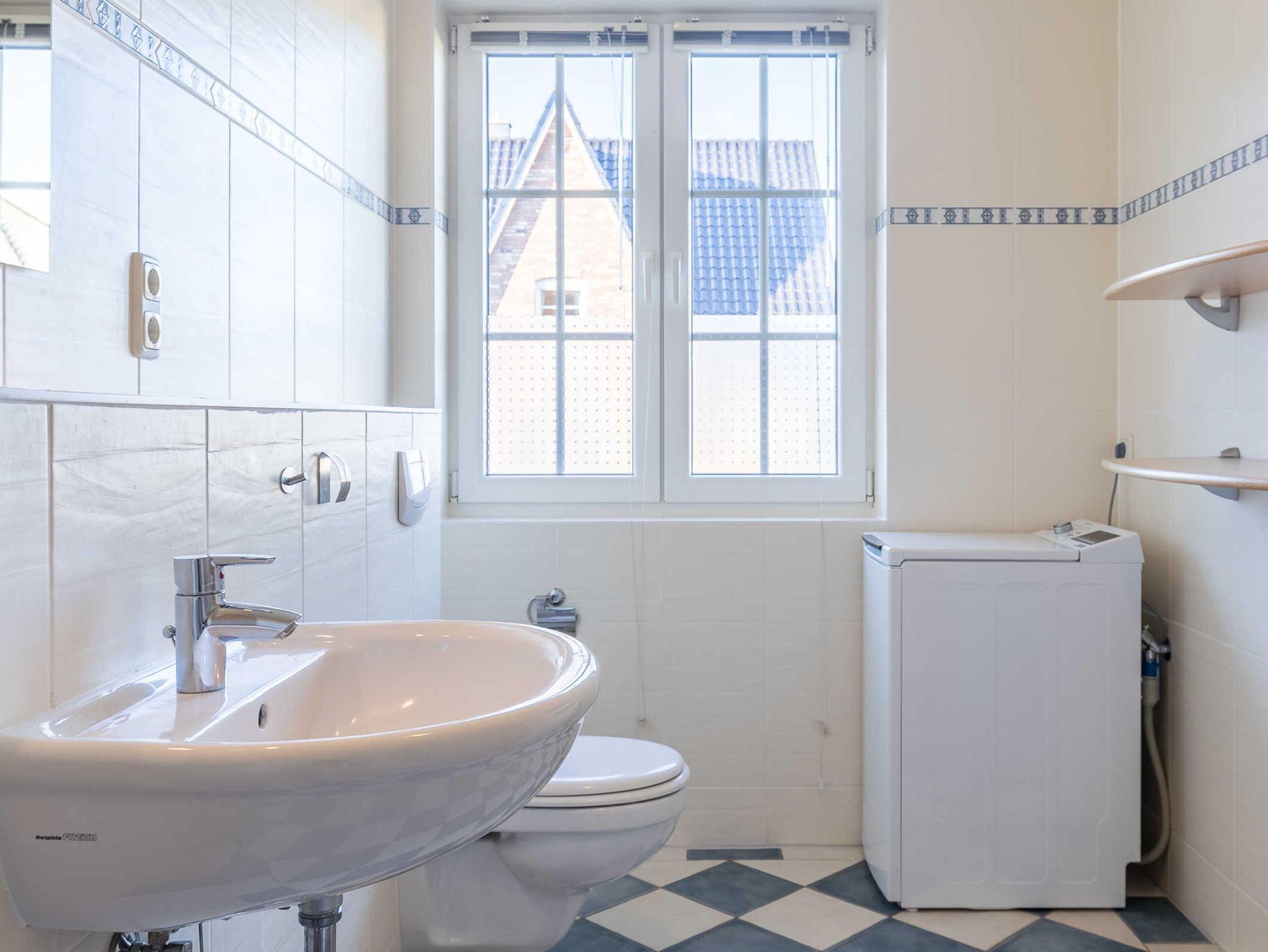 Das hell geflieste Badezimmer mit viel Tageslicht ist mit Dusche, WC und einer Waschmaschine ausgestattet.