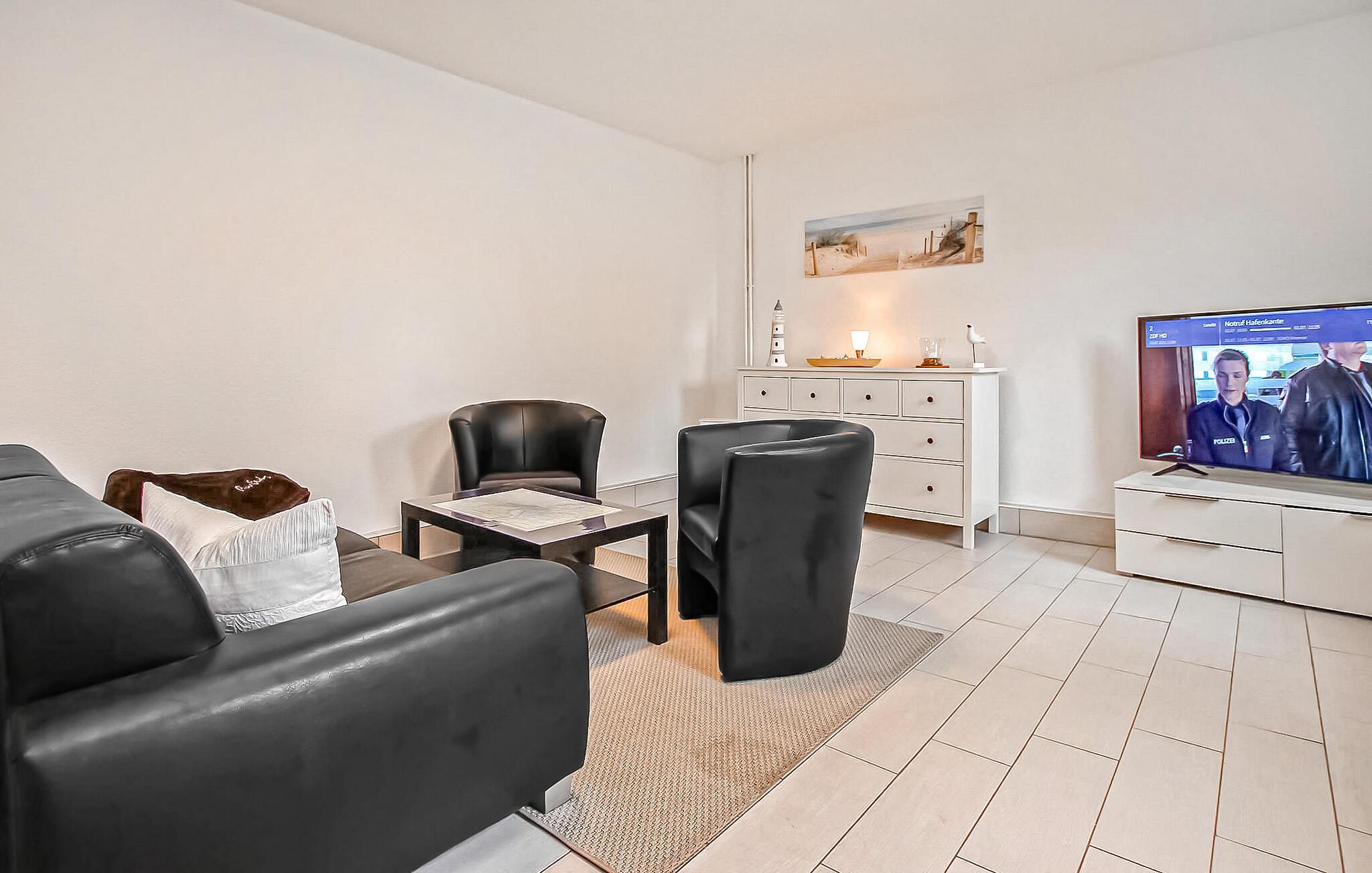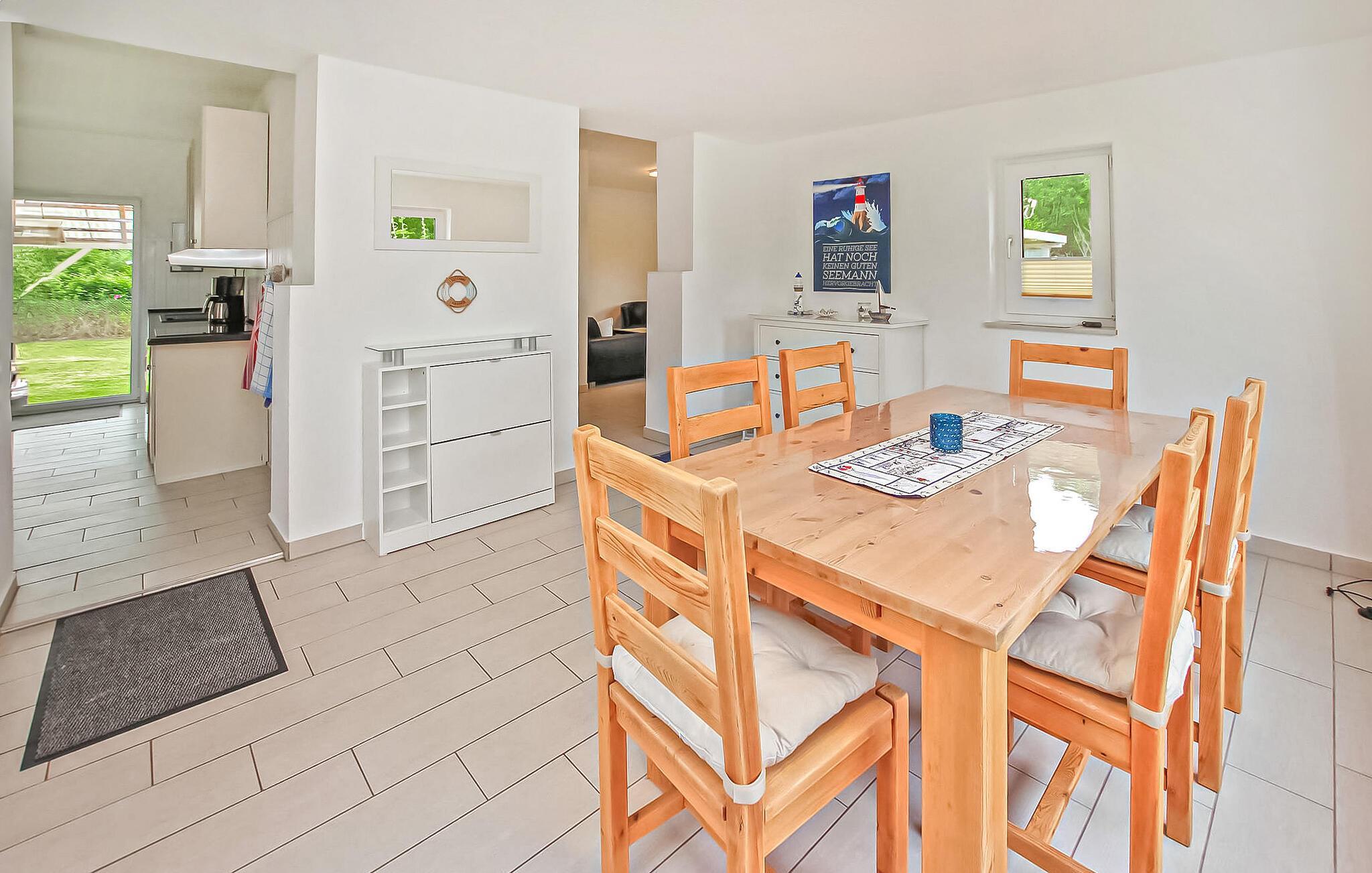Det ca 90 m² stora, ljusa, centralt uppvärmda, rökfria semesterhuset är utrustat med insektsnät och sträcker sig över två våningar. På bottenvåningen finns ett vardagsrum i öppen planlösning (lädersvit, platt-TV med streaming), en matsal (härifrån en vacker utsikt över Bodden) och köket (elspis med ugn, kyl med frys, diskmaskin, tvättmaskin, diverse små köksmaskiner) samt badrummet (dusch, wc, hårtork). På övervåningen (nås via trappa) finns två sovrum (1 x dubbelsäng, flatscreen TV, 1 x två enkelsängar).