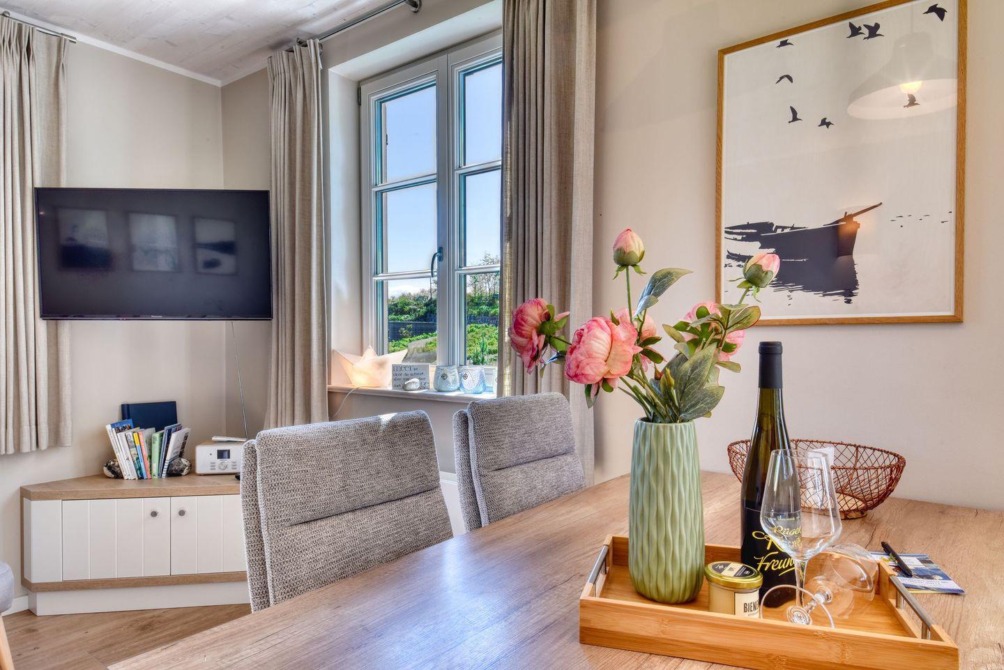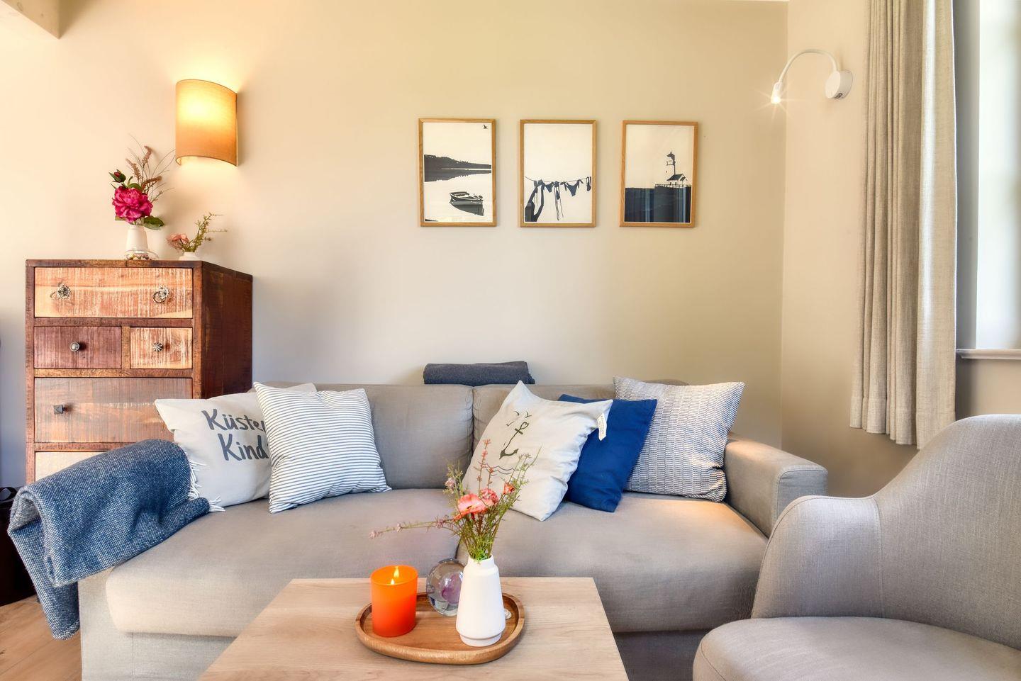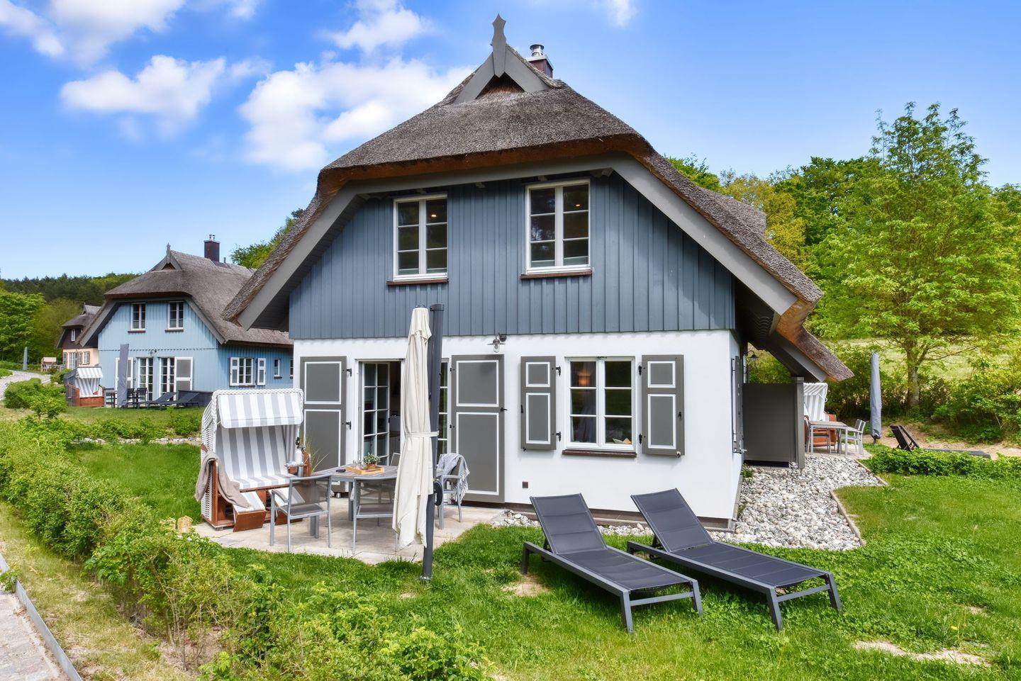 Im Feriendorf Klein Stresow werden Sie auf 61 Quadratmeter in Ihrer eigenen, stylischen Ferienhaushälfte mit Garten und Weitblick begrüßt . Hier beginnt der Urlaub für bis zu 4 Personen schon beim Eintreten. Wenn Sie es genau nehmen, schon beim Ankommen. Das Auto auf dem für Sie reservierten Stellplatz abgestellt, können Sie bei so viel sonniger Leichtigkeit erst einmal richtig durchatmen. Öffnen Sie die bodentiefen Fenster zu Ihrer Westterrasse weit und genießen Sie die frische Ostseebrise. Hier lässt es sich ausgezeichnet frühstücken. Das Innere Ihrer Ferienhaushälfte ist bis ins Detail aufs Feinste eingerichtet. Lampen, Möbel und Bilder sind nordisch nobel. Ein Sofa lädt zum Relaxen ein. Zur Ausstattung des Wohn-Esszimmers gehören ein Kamin und ein Flat-TV. Das WLAN können Sie kostenfrei nutzen. Ein schöner Esstisch mit vier Stühlen eignet sich bestens für die Mahlzeiten.