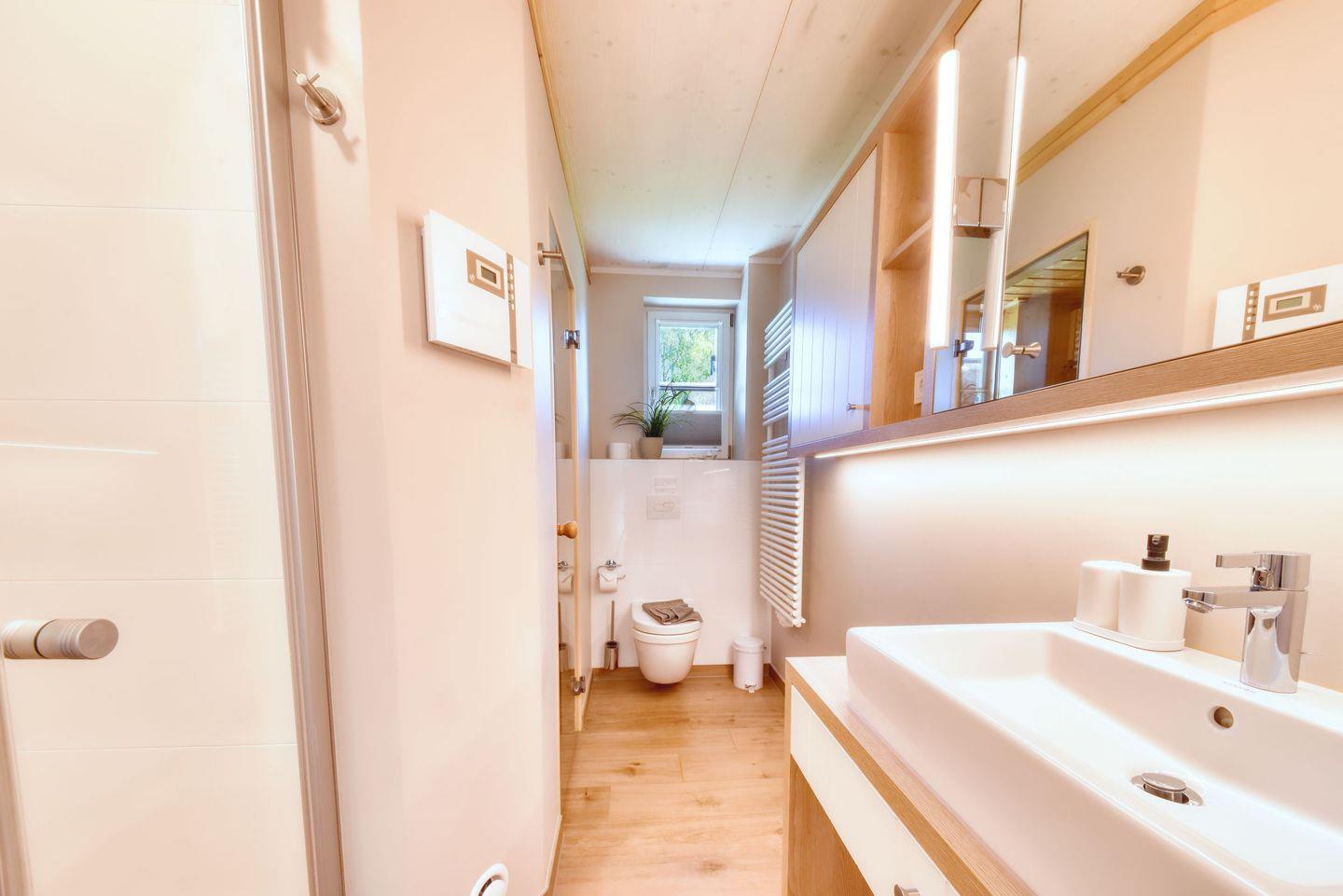 Zwei bequeme Boxspringdoppelbetten (180 x 200) versprechen erholsame Träume. Die Zimmer verfügen über je einen Kleiderschrank und ebenfalls einen Flat-TV. Eine 5. Person findet auf der Schlafcouch im Wohnzimmer Platz. Zwei Bäder mit Dusche und WC sorgen für genügend Raum zum Frischmachen. Das Bad im EG ist zudem mit einer Finnischen Sauna ausgestattet. Bei Anreise liegen Handtücher für Sie bereit und die Betten sind bezogen.