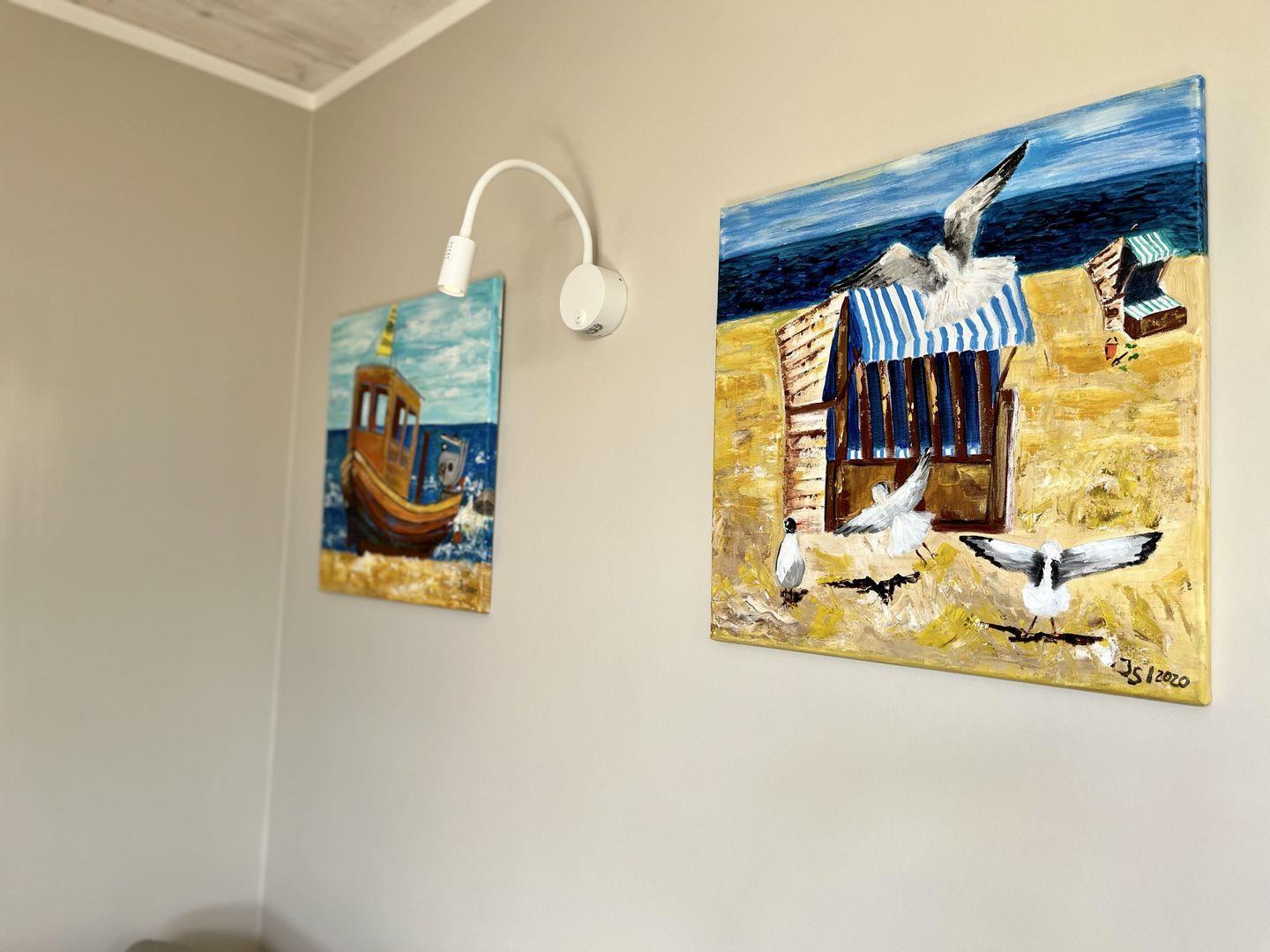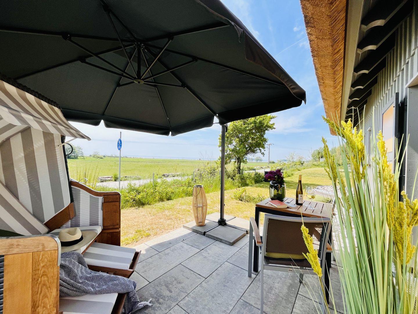 Im Feriendorf Klein Stresow werden Sie im „Seeblick-Ferienhaus Mein Ankerplatz“ auf 43 Quadratmetern in Ihrer eigenen, stylischen Ferienhaushälfte mit Garten begrüßt. „Mein Ankerplatz“ hat einen direkten, unverbauten Meerblick beim Relaxen auf der Terrasse und von jedem Zimmer aus. Hier beginnt der Urlaub für bis zu 2 Personen schon beim Eintreten. Wenn Sie es genau nehmen, schon beim Ankommen. Das Auto auf dem für Sie reservierten Stellplatz abgestellt, können Sie bei so viel sonniger Leichtigkeit erst einmal richtig durchatmen. Öffnen Sie die bodentiefen Fenster zu Ihrer Südterrasse weit und genießen Sie die frische Ostseebrise. Hier lässt es sich ausgezeichnet frühstücken. Das Innere Ihrer Ferienhaushälfte ist bis ins Detail aufs Feinste eingerichtet. Lampen, Möbel und Bilder sind nordisch nobel. Ein Sofa mit Ottomane lädt zum Relaxen ein. Zur Ausstattung des Wohn-Esszimmers gehört ein Flat-TV. Das WLAN können Sie kostenfrei nutzen. Ein schöner Esstisch mit vier Stühlen eignet sich bestens für die Mahlzeiten.