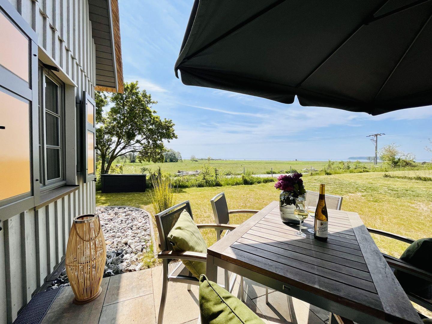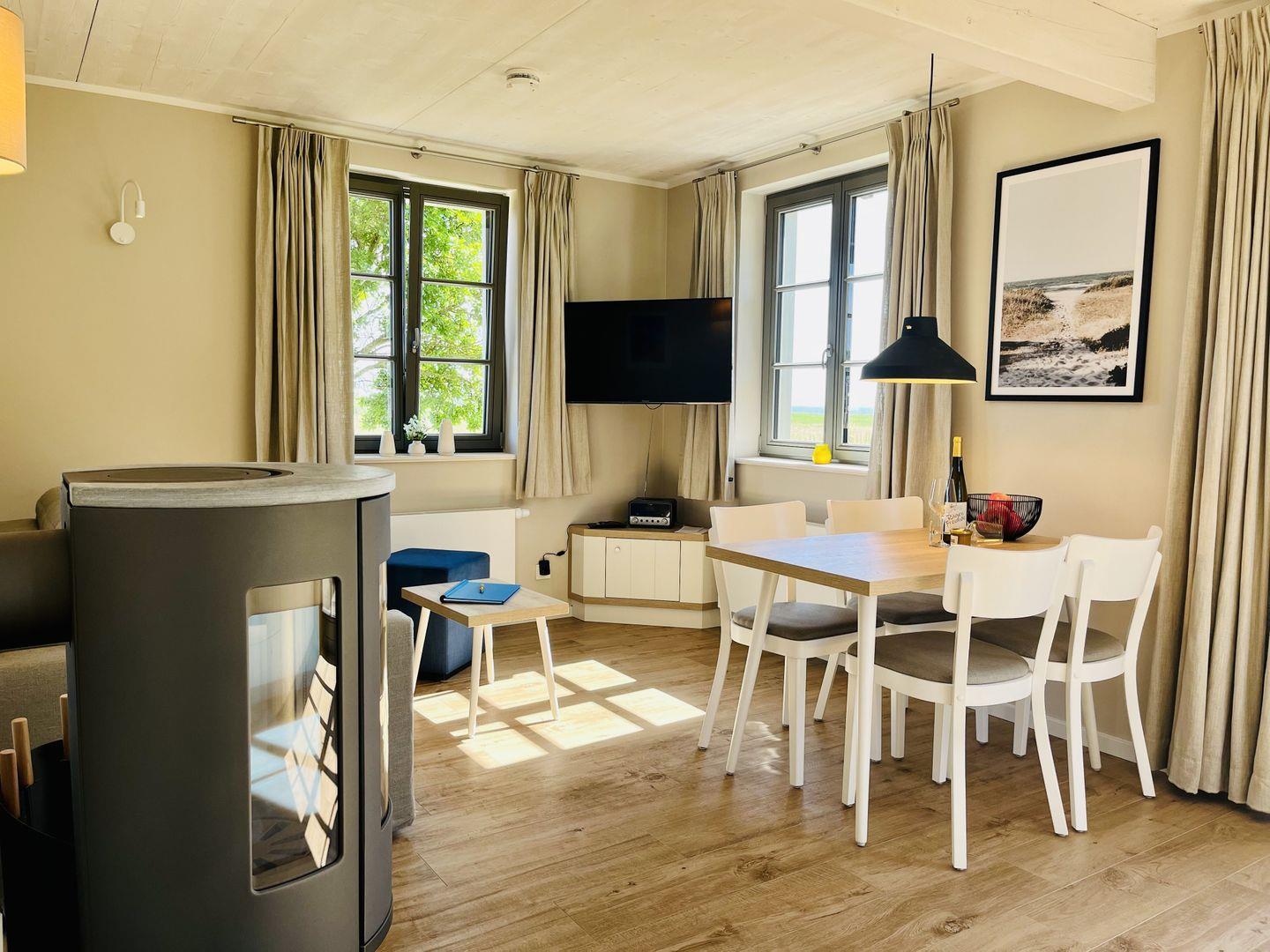 Im Feriendorf Klein Stresow werden Sie im „Seeblick-Ferienhaus Huus Waterkant“ auf 61 Quadratmetern in Ihrer eigenen, im skandi-chic eingerichteten Ferienhaushälfte begrüßt. Aus dem Wohn-/ Essbereich kommen sie stufenlos in den Garten und können den unverbauten Meerblick genießen. Hier beginnt der Urlaub für bis zu 4 Personen schon beim Eintreten. Wenn Sie es genau nehmen, schon beim Ankommen. Das Auto auf dem für Sie reservierten Stellplatz abgestellt, können Sie bei so viel sonniger Leichtigkeit erst einmal richtig durchatmen. Öffnen Sie die bodentiefen Fenster zu Ihrer Südterrasse weit und genießen Sie die frische Ostseebrise. Hier lässt es sich ausgezeichnet frühstücken. Das Innere Ihrer Ferienhaushälfte ist bis ins Detail geschmackvoll eingerichtet. Lampen, Möbel und Bilder sind harmonisch aufeinander abgestimmt. Ein Sofa mit Ottomane lädt zum Relaxen ein. Zur Ausstattung des Wohn-Esszimmers gehören ein Kamin und ein Flat-TV. Das WLAN können Sie kostenfrei nutzen. Ein schöner Esstisch mit vier Stühlen eignet sich bestens für gesellige Stunden bei gutem Essen.
