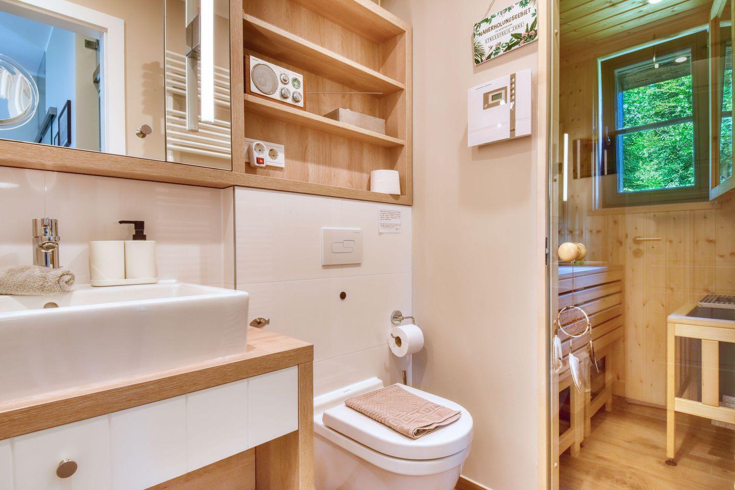 Aber auch zum Faulenzen ist Ihr „Heim auf Zeit“ eingerichtet. Nicht nur bei Kälte draußen ist die Sauna mit Waldblick in kurzer Zeit einsatzbereit.