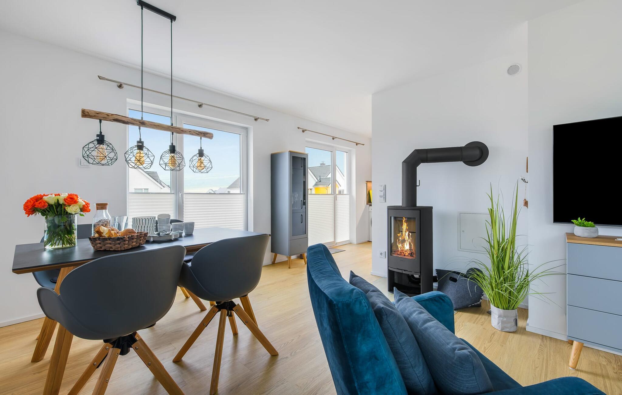 Golvvärmen och den vedeldade kaminen i KLEINEN KOGGE garanterar en mysig stämning även under årets kallare månader.