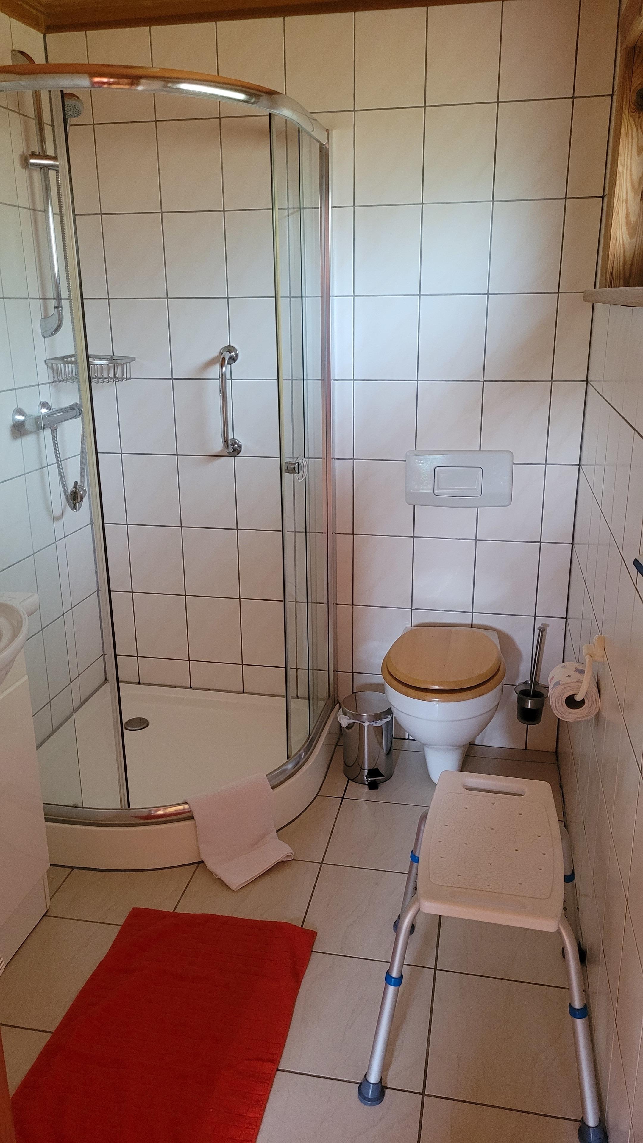 Die Ferienwohnung erstreckt sich über 2 Etagen. Im Erdgeschoß befindet sich der Wohnraum, die Küche mit Essecke und das Bad mit Dusche/WC und Waschtisch. Durch eine Balkontür gelangen Sie zur Außenterrasse. Wohnraum, Küche und Essecke sind als offene Bereiche miteinander verbunden. Der Wohnbereich ist mit einem Sat-TV, CD-Player, Radio und einer gemütlichen Couch ausgestattet.