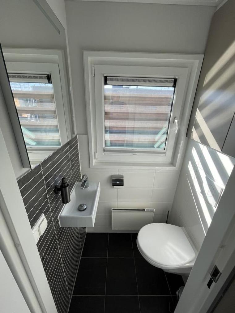 - WC-Raum wandhängendem WC inkl. Drückerplatte mit 2-Mengenspülung, wandhängende WC-Bürste, wandhängender Papierrollenhalter mit Waschtisch und Spiegelleuchte, Einbaudownlight, Elektroheizkörper, Sonnen- und Sichtschutz (Plissees), Insektenschutzgitter, etc.