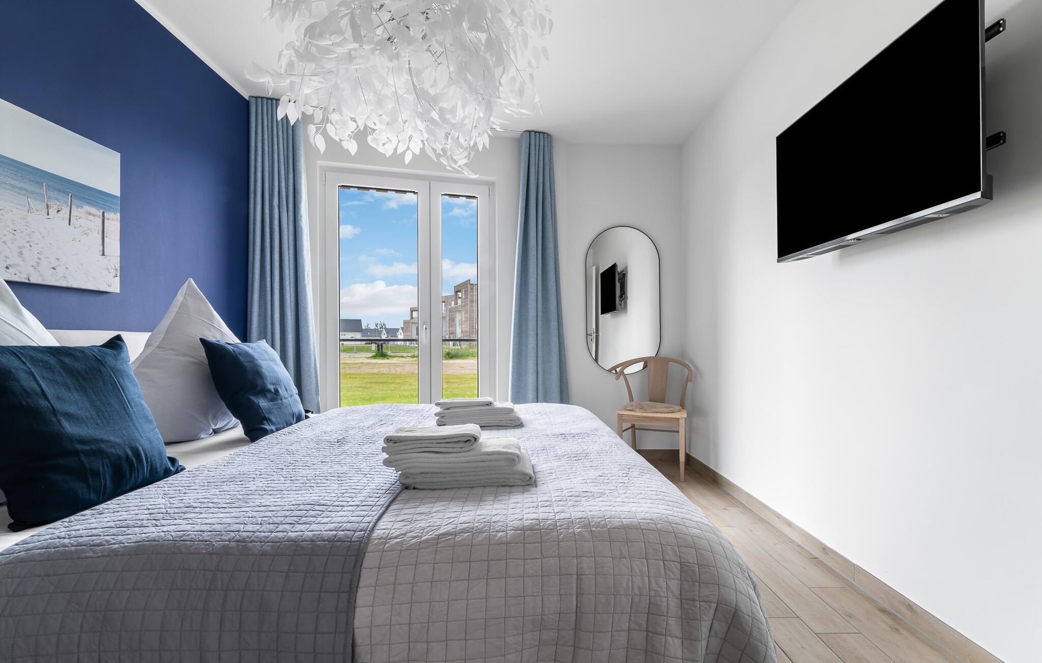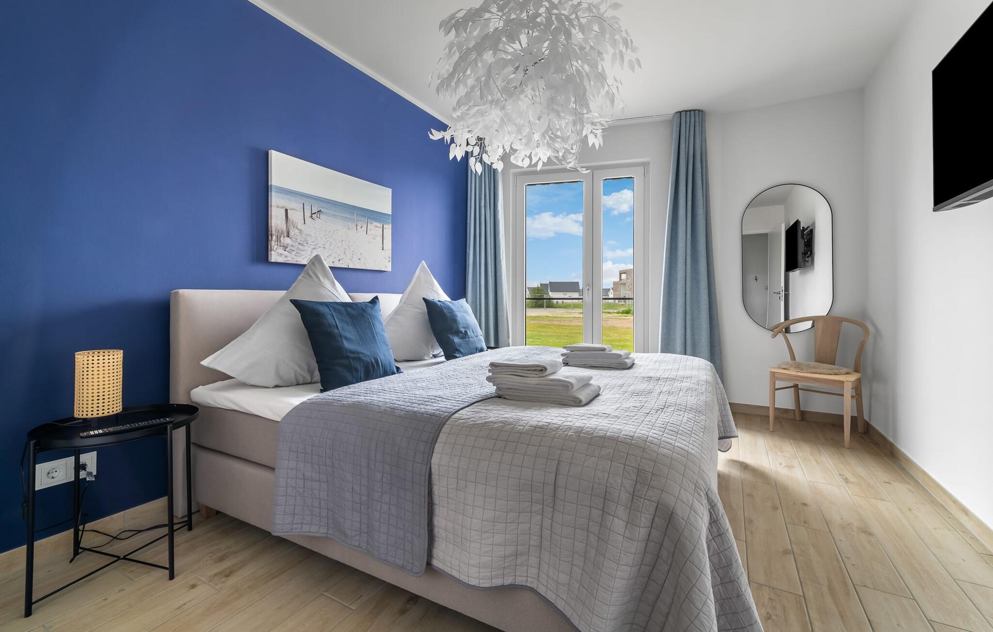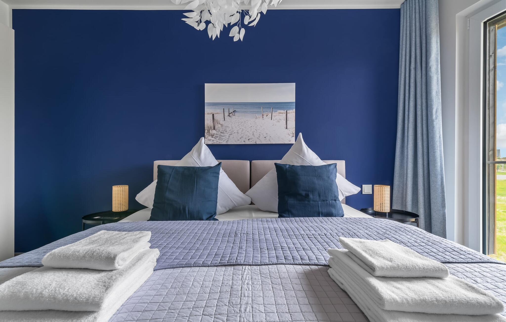 Det nordiskt-maritima vardagsrummet domineras av den bekväma loungen med TV och vedeldad kamin, som lyckas skapa en mysig atmosfär även i klassiskt nordtyskt väder. Den exklusiva skandinaviska inredningsstilen med boho-inslag är precis vad som krävs för sanna fans av den höga norden. Och för sportfantaster finns det en vattenroddmaskin inomhus.