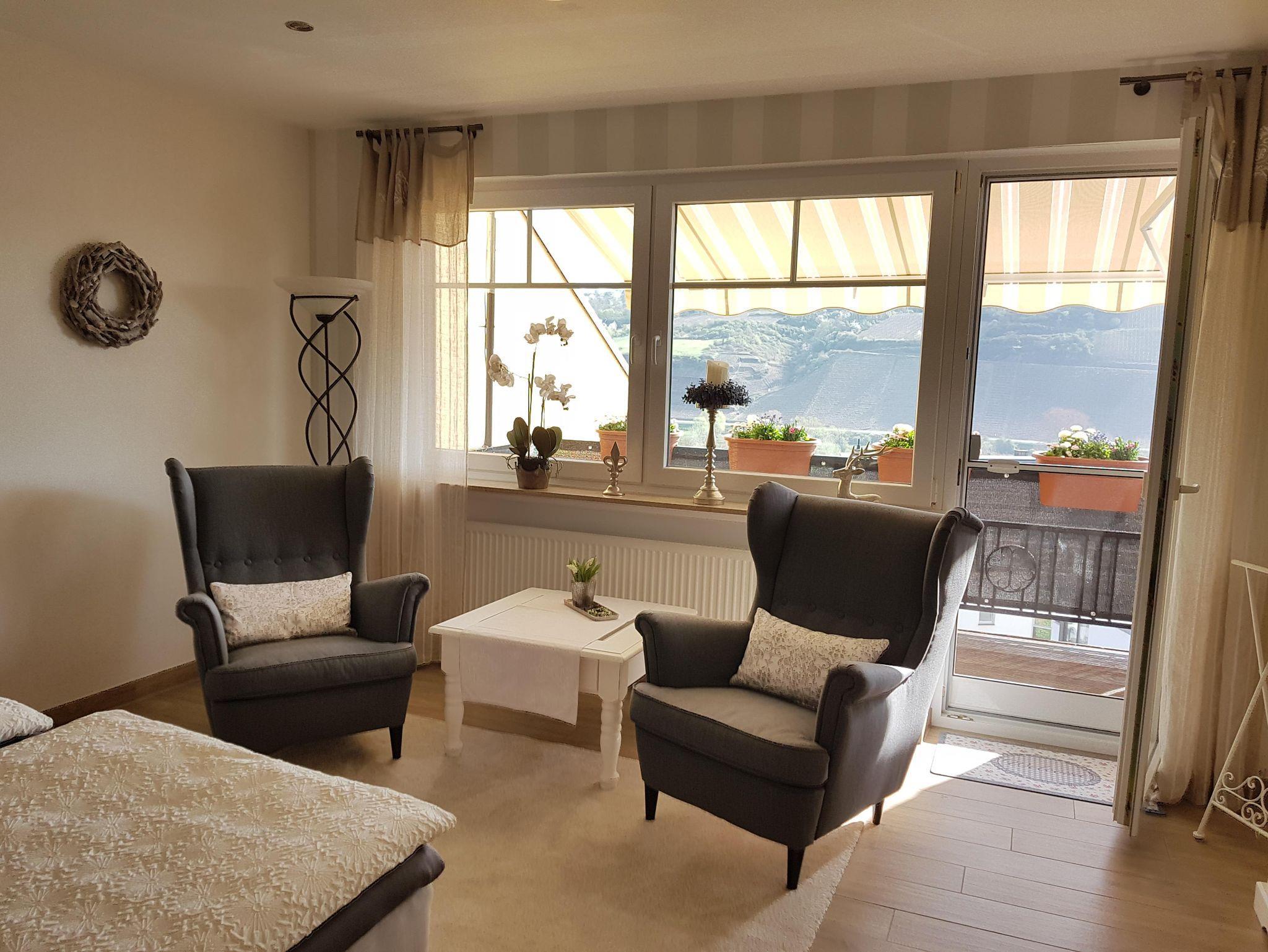 Unser neues Appartement, soll Ihnen eine ganz besondere Auszeit, hier an der Mosel verschaffen. Deshalb haben wir bei der Einrichtung unser Augenmerk auf absolutes Wohlfühlen gerichtet. Zum Appartement gelangen Sie über Ihren eigenen Eingang. Unsere kleine Ferienwohnung im Landhausstil ist ca. 42 m² groß. Sie umfasst einen kombinierten Wohn-Schlafbereich, eine vollausgestattete Küche mit gemütlichem Essbereich sowie ein Bad mit ebenerdiger Dusche. Terrasse mit überdachten Freisitz und Balkon mit Moselblick gehören auch dazu. Hier dürfen sich ab sofort gerne 2 Gäste wohlfühlen.