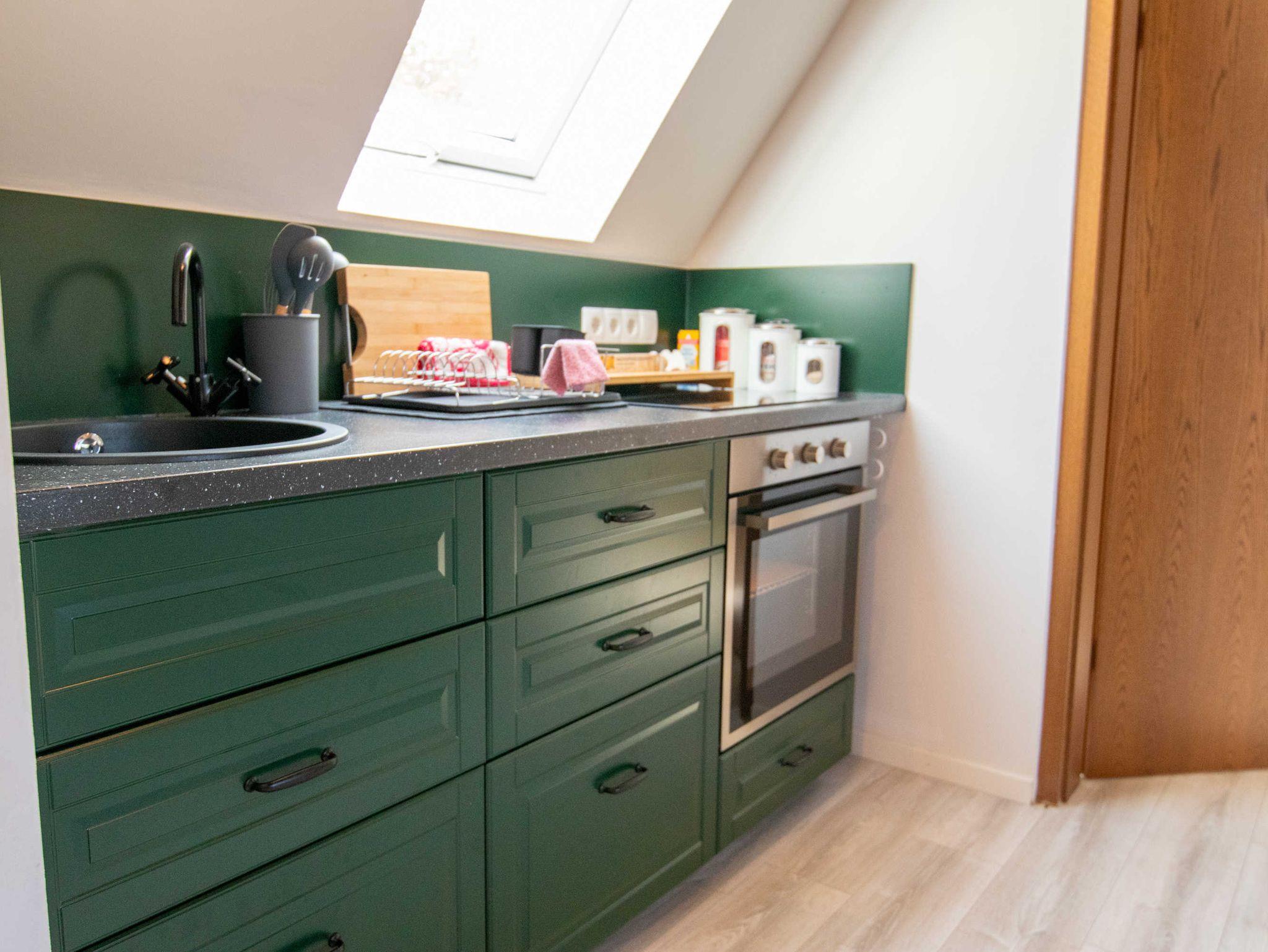 Der Küchenbereich ist zweigeteilt. Im Essbereich befinden sich der Kühlschrank mit Gefrierfach, Wasserkocher, Toaster und Kaffeemaschine. Der Rest der Küche ist komplett ausgestattet mit einem modernen Induktionsherd, einer Spüle, Geschirr, Besteck, Gläser und Kochtöpfen.