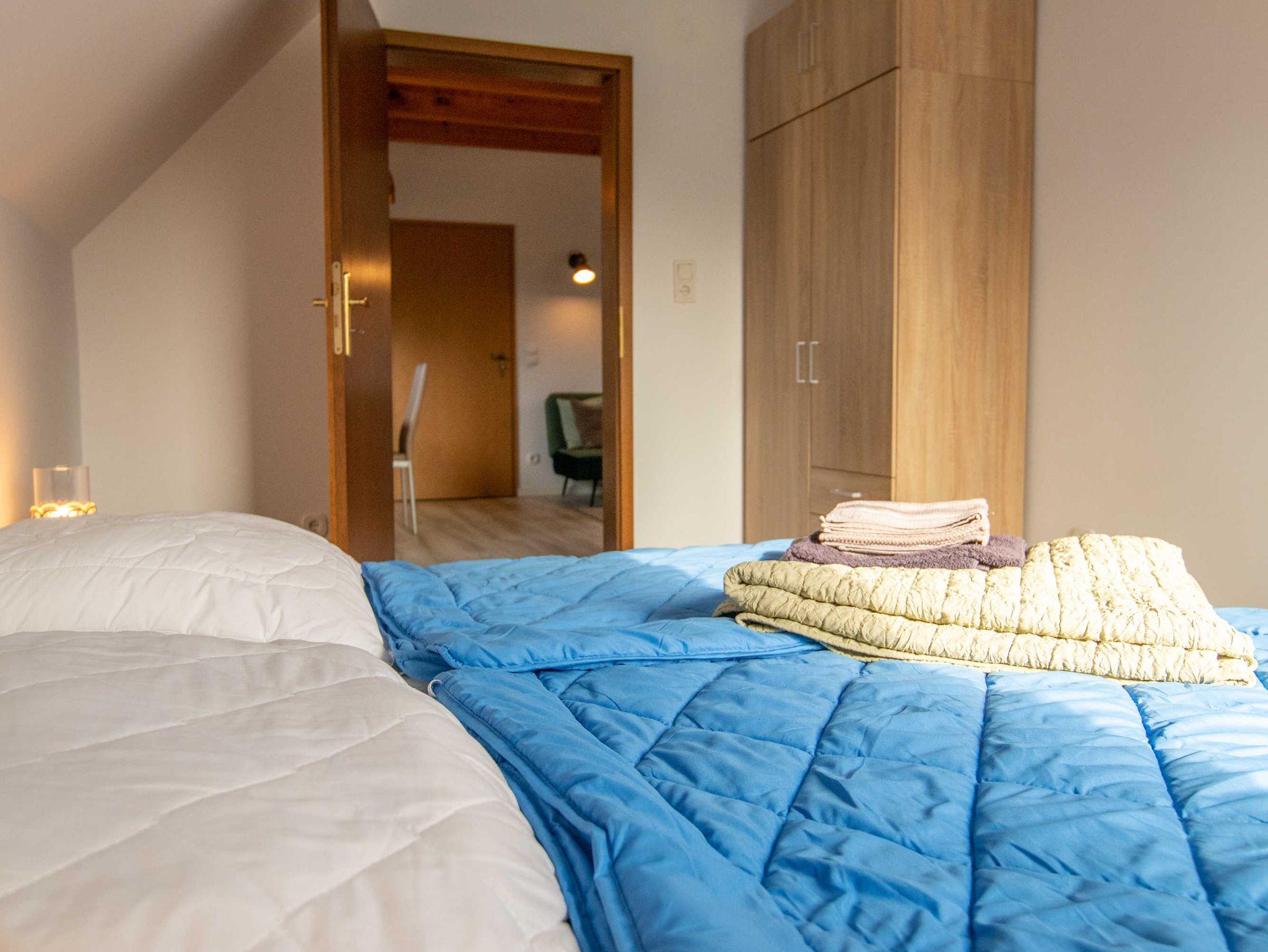 In der 51 m² großen, rustikal modern eingerichteten Wohnung befinden sich zwei Schlafzimmer, ein Duschbad mit WC und eine helle geräumige Wohnküche mit großem Esstisch. Für Babys steht ein Hochstuhl und ein Reisebett bereit. Ein Schlafzimmer ist mit einem Doppelbett (180x200), Kleiderschrank und zwei Nachttischen ausgestattet, das andere Schlafzimmer mit zwei Einzelbetten (90x 200), einem großen Kleiderschrank, einem Garderobenständer, einer Kommode und verschiedenen Spielen für die ganze Familie. Eine Klappcouch im Wohnbereich kann als 5. Schlafgelegenheit genutzt werden.