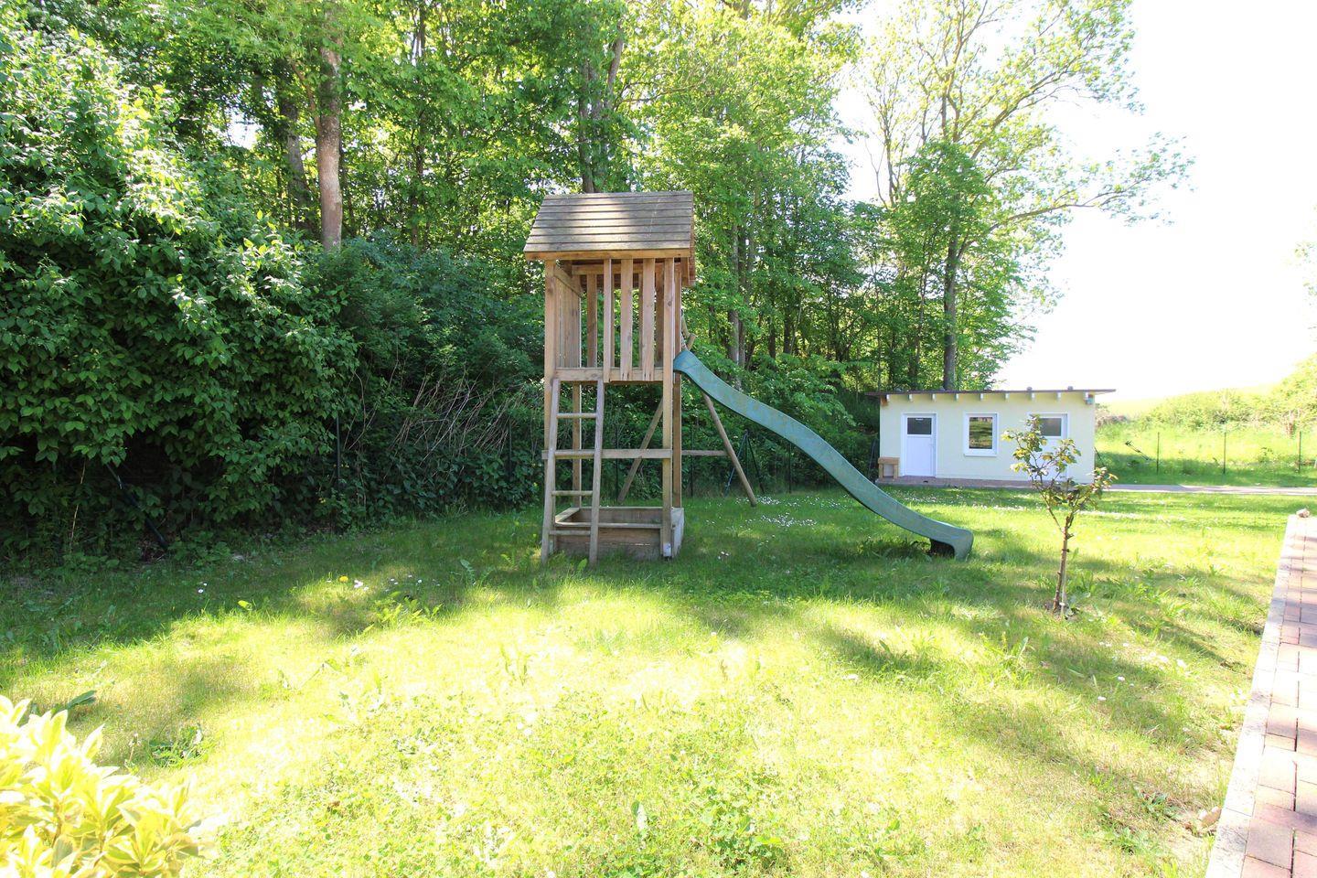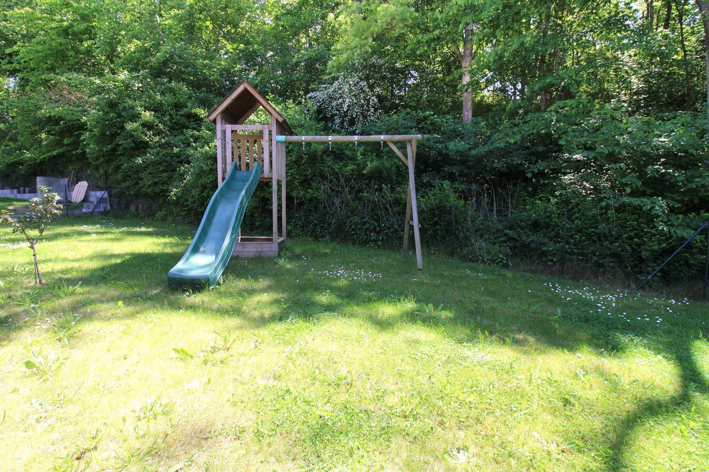 Kindern steht im Garten ein Spiel- und Klettergerüst mit Rutsche und Schaukeln zur Verfügung – hier können diese ihrem Spieltrieb im Urlaub freien Lauf lassen und nach Herzenslust toben!