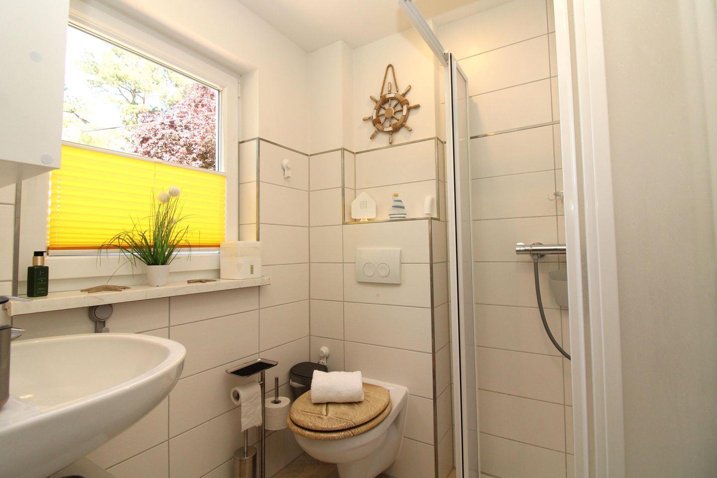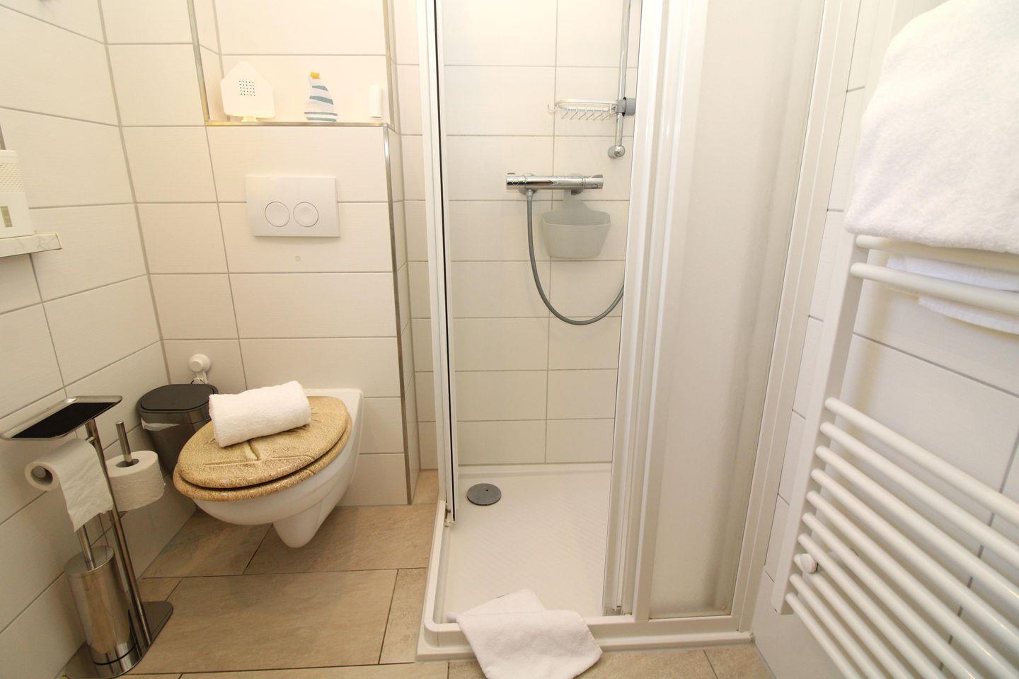 Das Badezimmer (mit Tageslicht / Fenster) verfügt über eine Dusche mit niedrigem Einstieg (seniorenfreundlich!), Waschbecken mit Unterschrank, einen Badezimmerschrank, WC, Föhn sowie ausreichend Ablagemöglichkeiten.