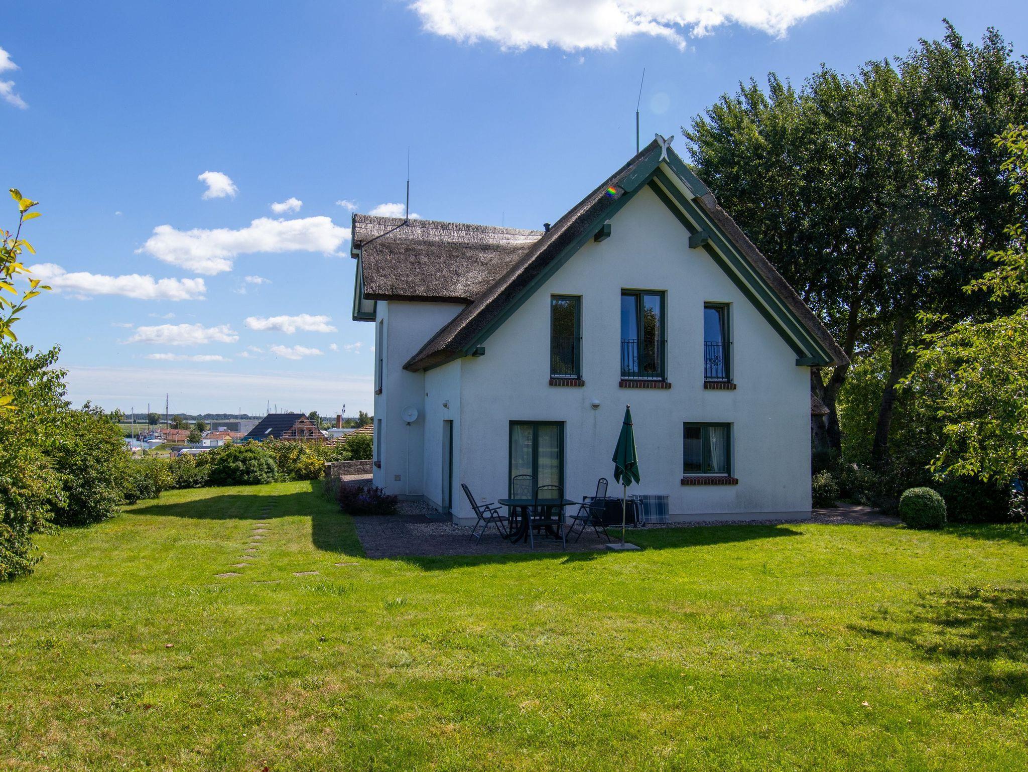 Das reetgedeckte, bildschöne Ferienhaus mit Seeblick und großem Garten liegt auf einer Anhöhe im idyllischen Fischerdorf Freest nah am kleinen Fischerhafen in Freest.