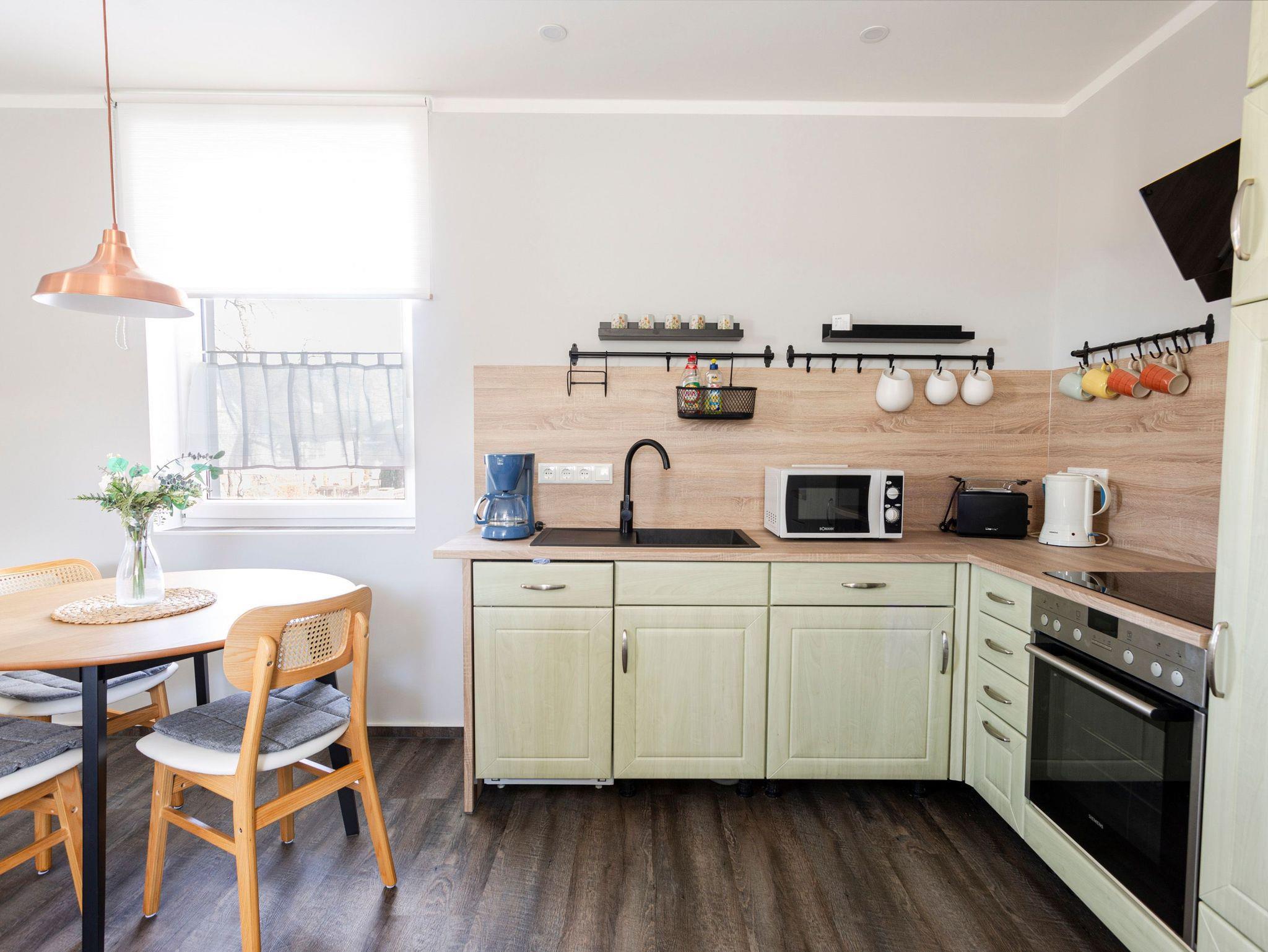 Die Ferienwohnung Alter Bahnhof in Kröslin befindet sich im Haupthaus mit separatem Eingang. Auf 36 m² Wohnfläche gibt es ausreichend Platz für 2-3 Personen. Das Wohnzimmer verfügt über ein Schlafsofa (80x200), einen TV und eine offene Küche. Die Küche ist mit allem ausgestattet, was du für eine kleine Auszeit benötigst. Hier stehen dir neben einem Kühlschrank, Backofen, Herd, Mikrowelle und Kaffeemaschine auch die täglichen Kochutensilien zur Verfügung. Im separaten Schlafzimmer erwarten dich zwei Einzelbetten (90x200), ein TV und ein Kleiderschrank. Das Bad verfügt über eine ebenerdige Dusche, Waschbecken und WC.