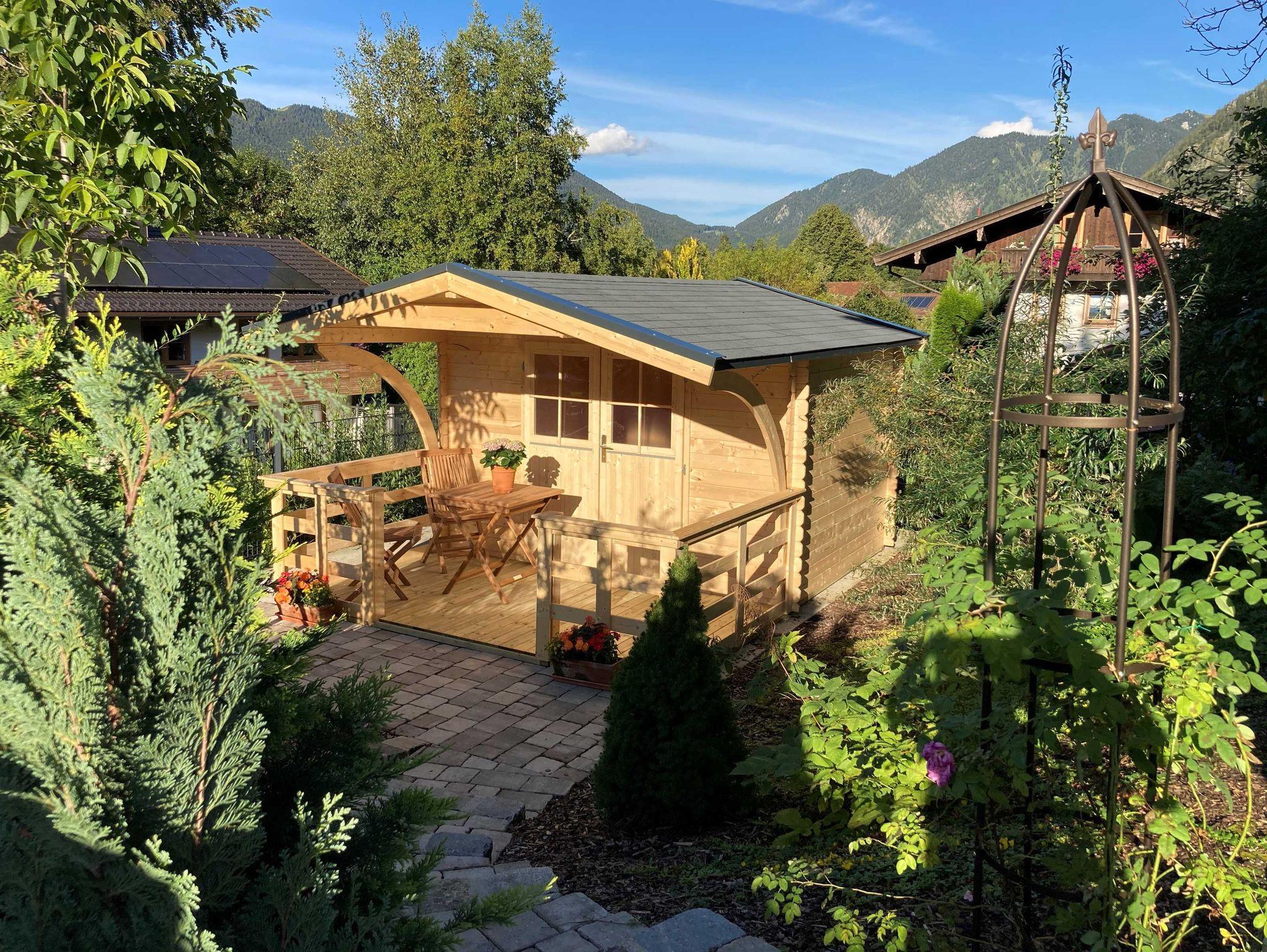 Behagliche, aber moderne Ferienwohnung mit Schwedenofen und Balkon und kleinem Sitzbereich vor dem Haus.