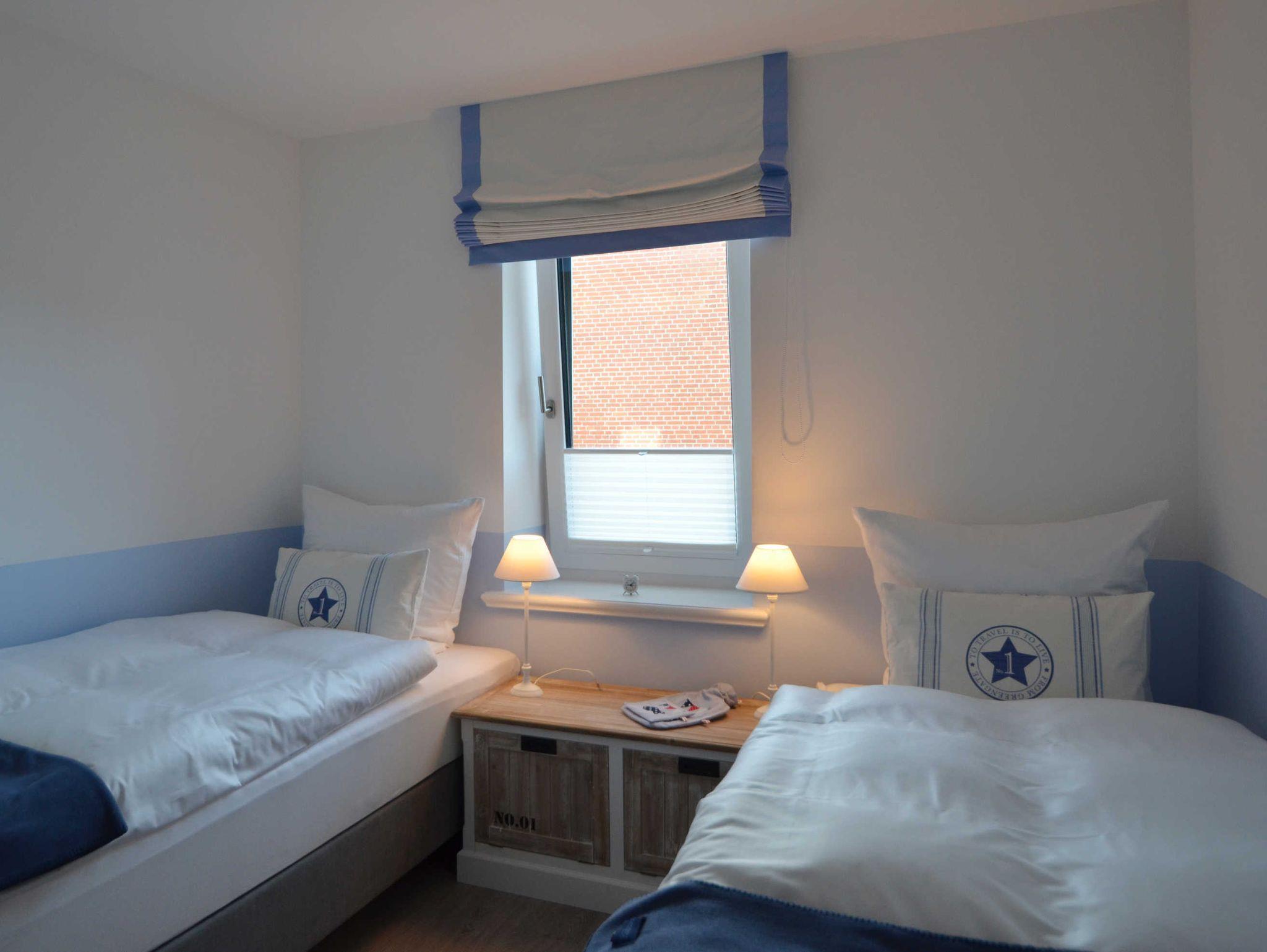 Der Bezug zur See ist in der Ferienwohnung Skagen im Erdgeschoss deutlich zu erkennen. Die Einrichtung ist im maritimen Stil in den Farben Weiß und Blau gehalten und wird durch ausgewählte Accessoires von GreenGate ergänzt.