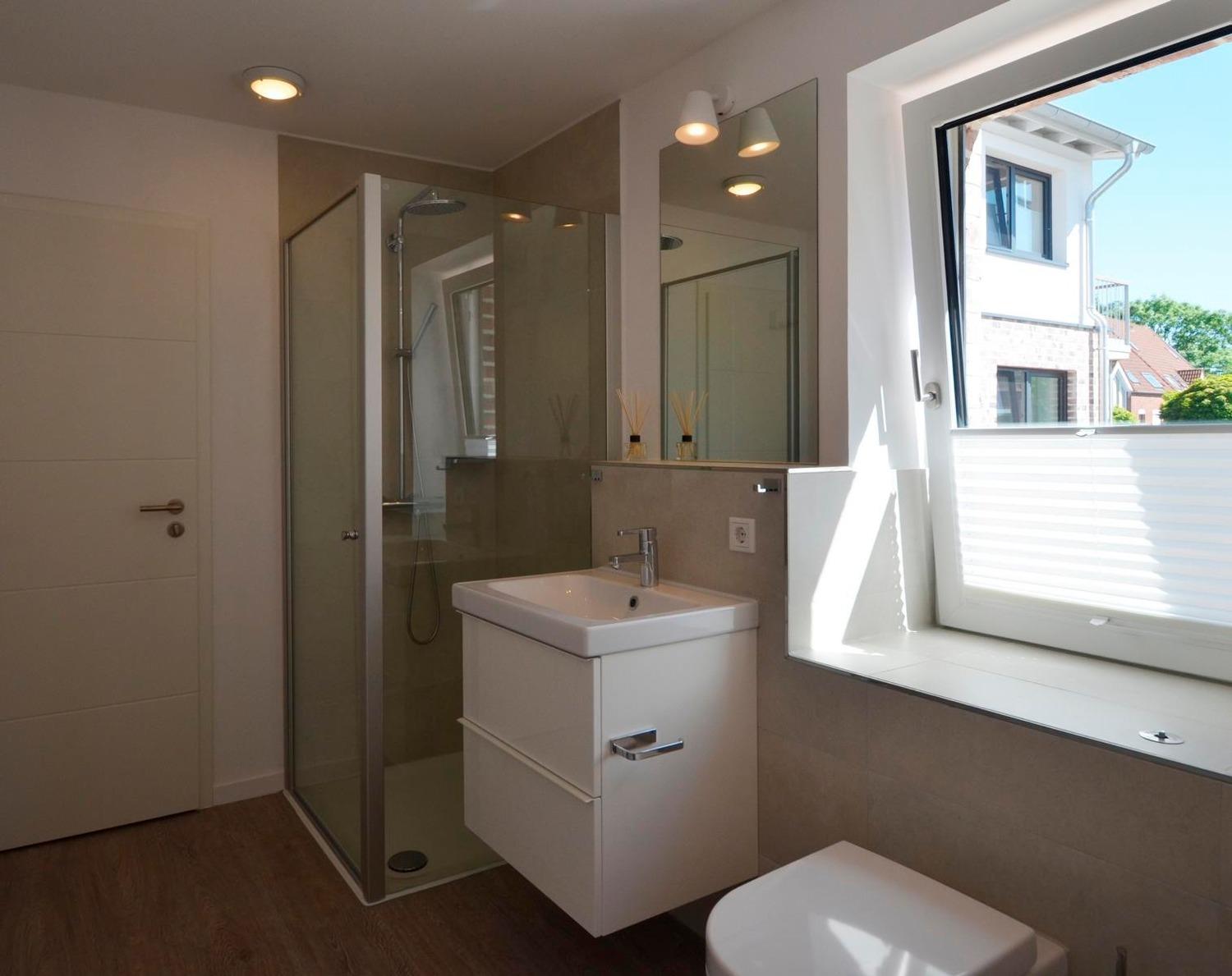 Dieses Bad besticht durch seine hellen Fliesen und eine geräumige Funktionalität. Es ist mit einer Dusche (RAINSHOWER) und einer BADEWANNE, einem WC sowie einem Waschtisch mit Unterschrank ausgestattet.