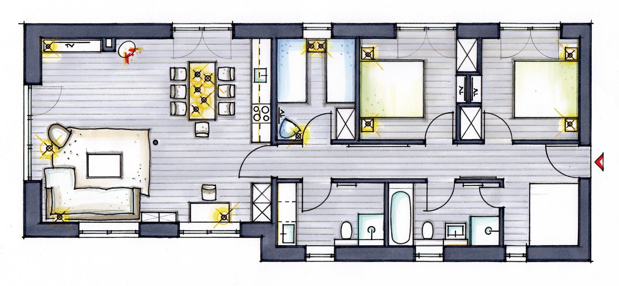Gegenüber den Schlafzimmern befinden sich zwei Bäder, eines davon mit direktem Zugang zur Sauna.