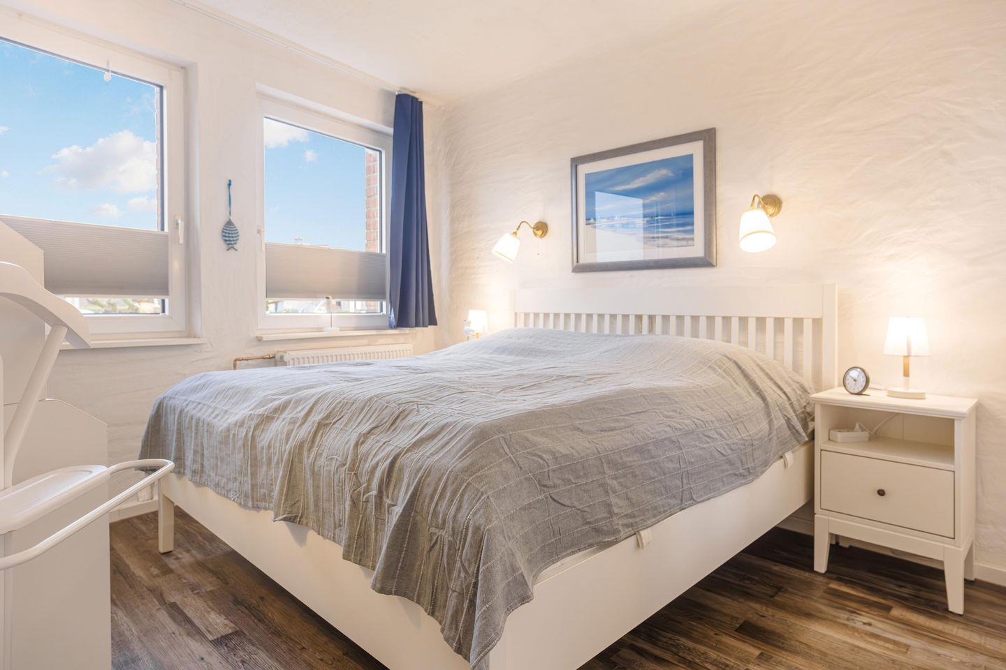 Das Schlafzimmer besteht aus einem Doppelbett (2 x 90 x 200 cm), 2 Nachttischen, einer offenen Kleider-, Regal- und Schubladenkombination mit ausreichend Platz für Ihre Urlaubsgarderobe, einer Ambienteleuchte, 2 Wand- und 2 Leselampen, Verdunkelungs-Plissées und Vorhängen sowie einem eingebauten Fliegengitter.