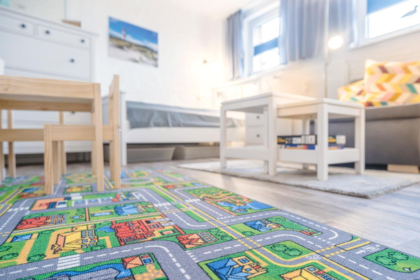 Das zweite Schlafzimmer im Souterrain besteht aus 2 Einzelbetten (90 x 200 cm), mit je einer Wandleuchte, einer Leselampe, einer geräumigen Kommode, ein auf 90 x 200 cm ausziehbarer Schlafsessel und einem Nachttisch mit Matratzenauflage im Kabuff (5. Schlafmöglichkeit) sowie Couchtisch, Teppich, Deckenfluter mit integrierter Leselampe, Dartscheibe und … falls Sie mit kleinen Kindern anreisen: Spielteppich mit kleinen Autos, Maltisch und 2 Stühlchen vervollständigen das Interieur. Ferner ist das Zimmer ebenfalls mit Verdunkelungs-Plissées, Vorhängen und im Fenster integriertem Fliegengitter ausgestattet.