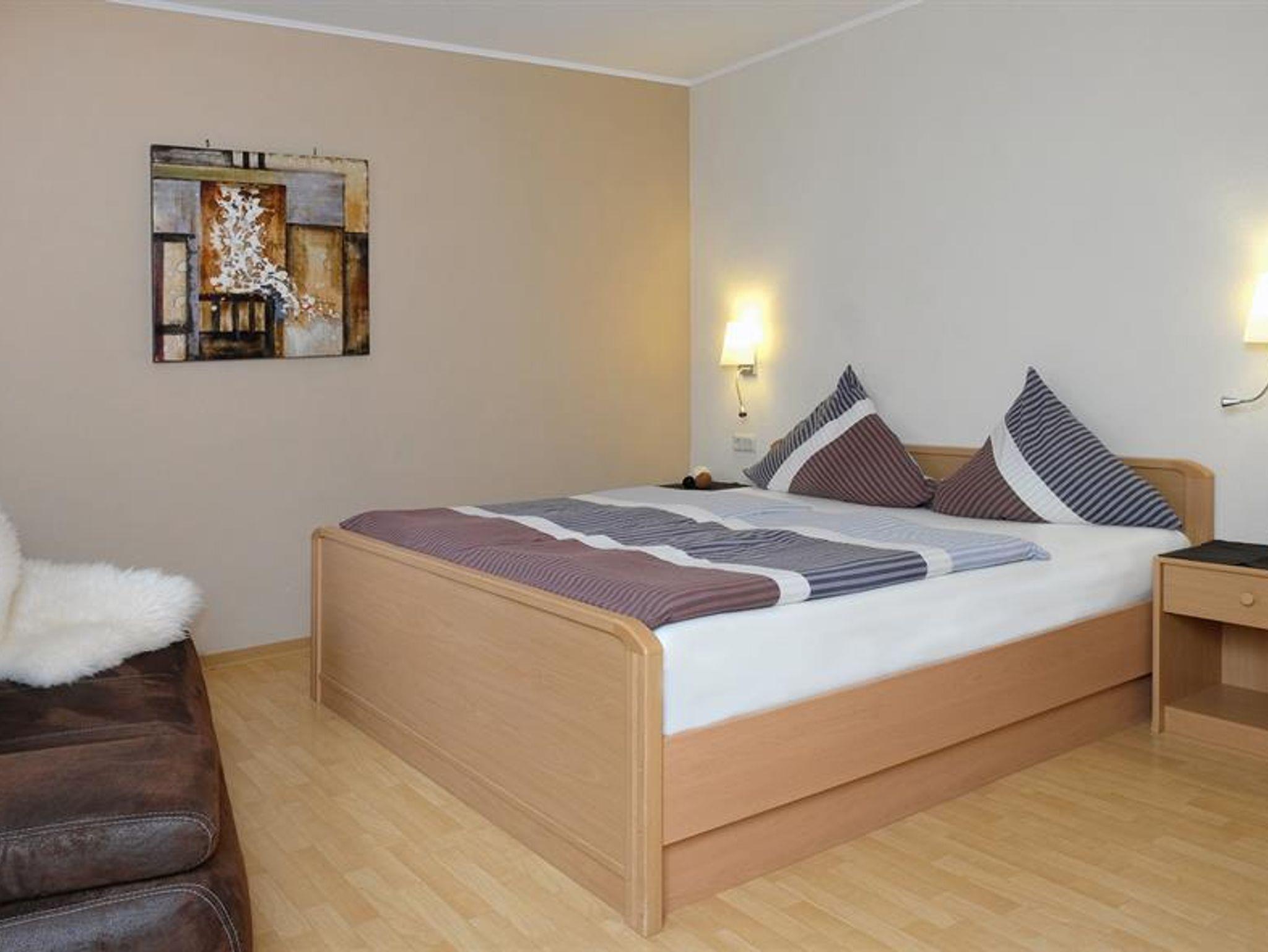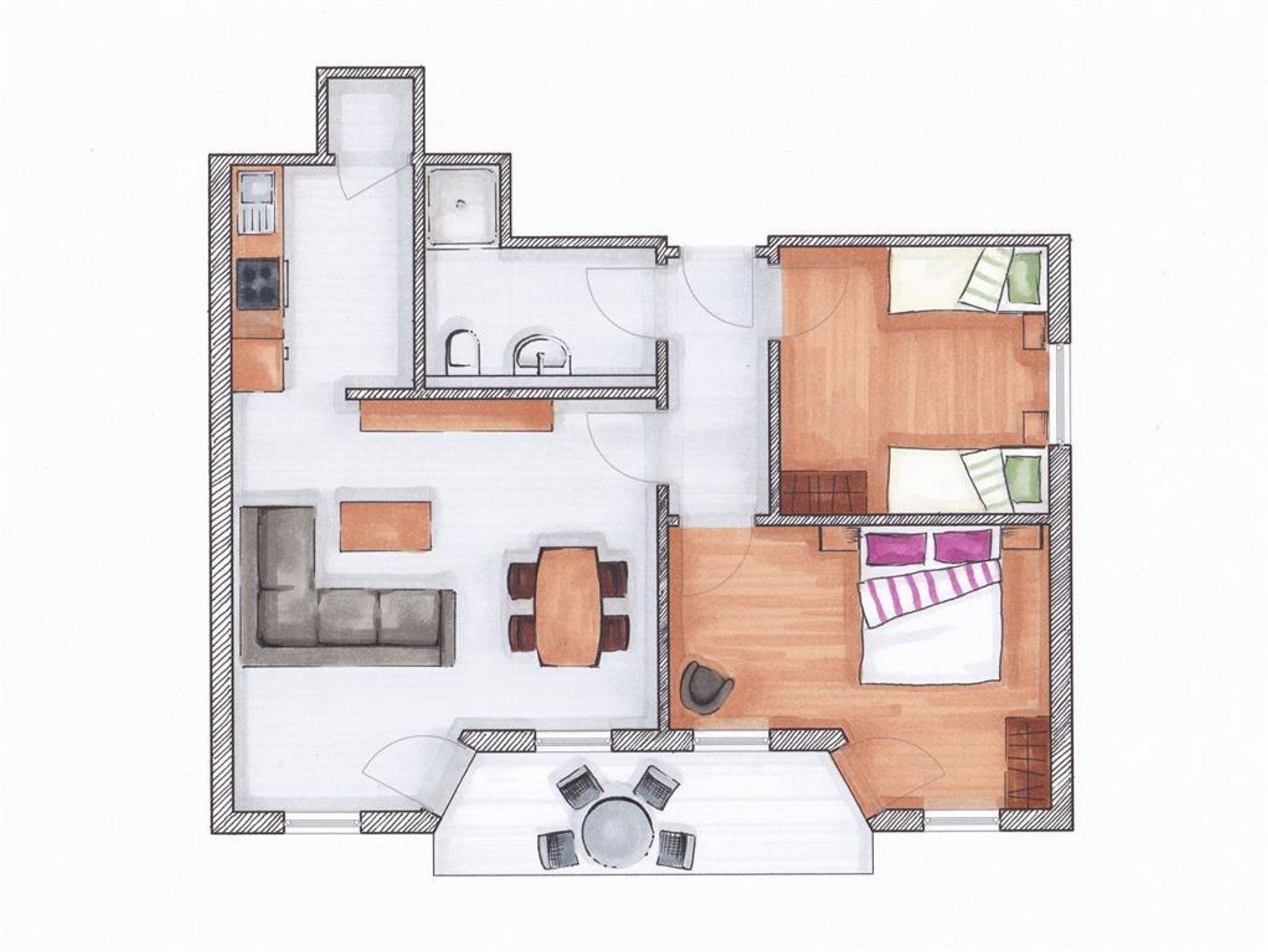 - Schlafzimmer 1 mit einem Kingsize-Bett (180-200) und Schlafzimmer 2 mit 1x Einzelbett und 1x Hochbett.