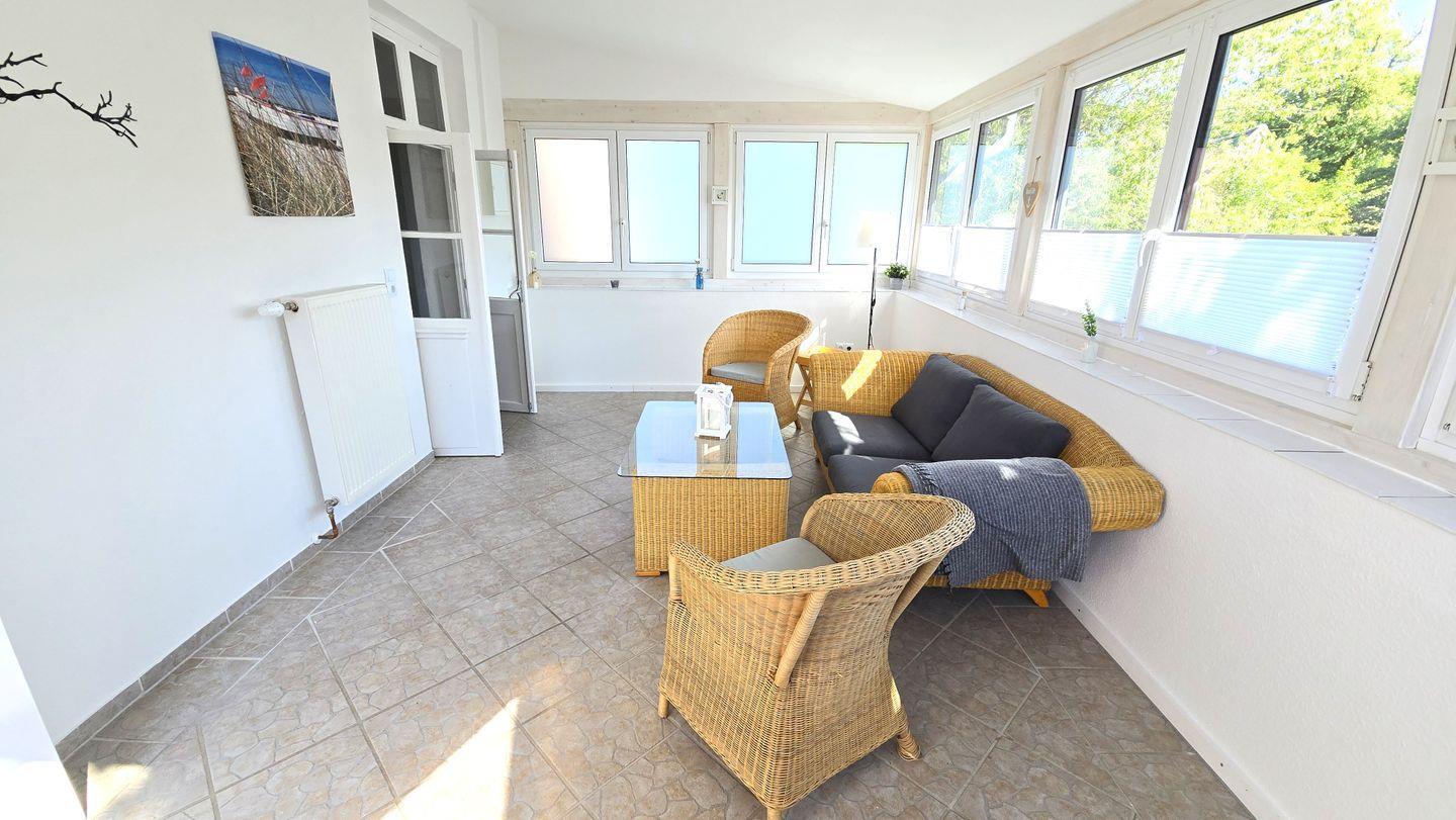 Der Wohnbereich bietet eine gemütliche Sitzecke mit Couch, Schaukelstuhl und Fernseher. Vom Doppelbettzimmer und der Küche aus gelangt man in den verglasten Wintergarten mit Blick in den Garten, der zusätzlichen Raum zum Verweilen bietet. Die Küche ist vollständig ausgestattet mit Herd, Backofen, Kühlschrank, Spülmaschine, Kaffeemaschine, Wasserkocher und Toaster. Ein Esstisch mit fünf Sitzplätzen befindet sich ebenfalls im Küchenbereich.