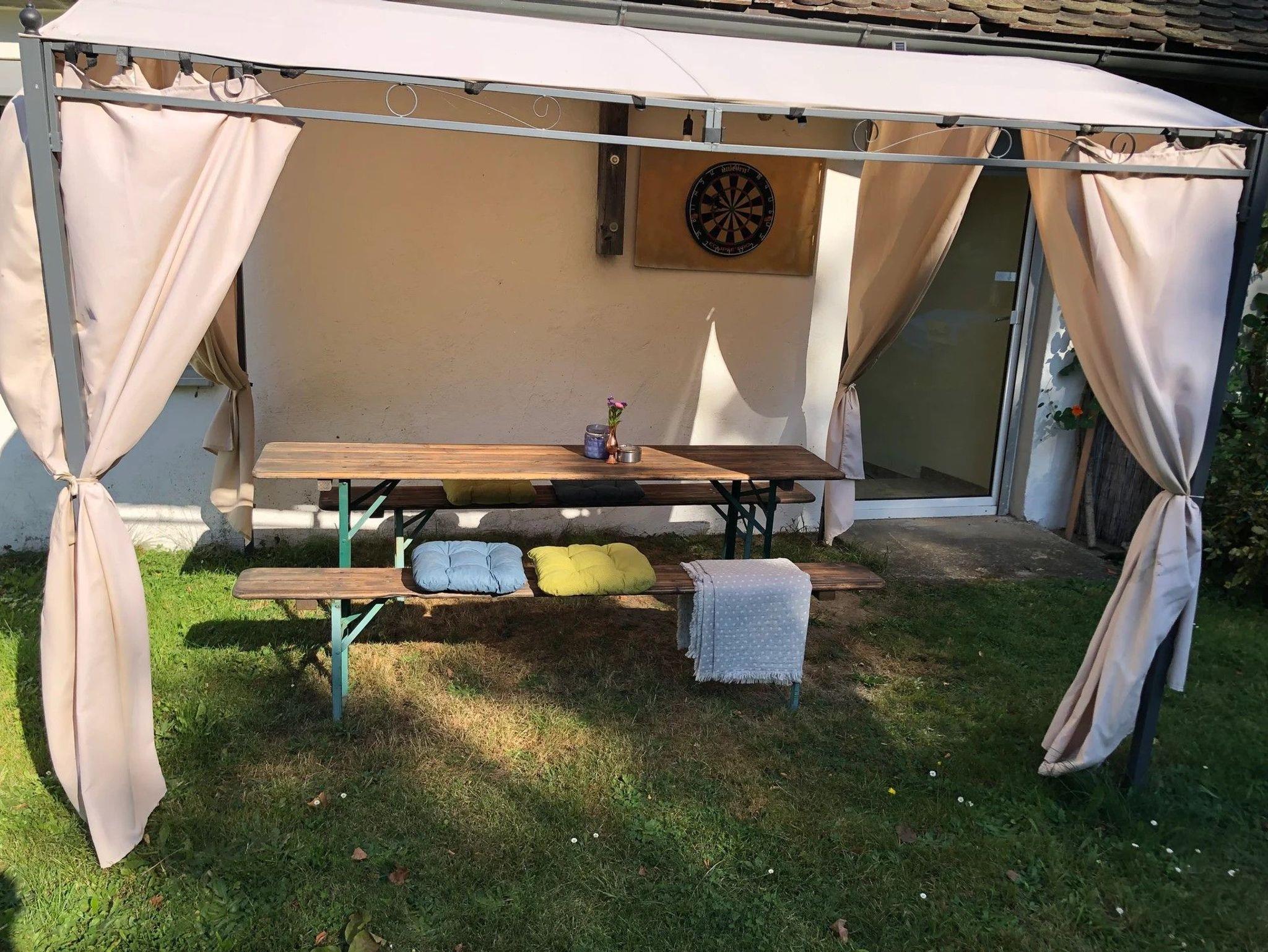 Im Wohnzimmer steht ein gemütliches Sofa, das bei Bedarf in eine bequeme Schlafgelegenheit mit Lattenrost (2m x 1,20) verwandelt werden kann.