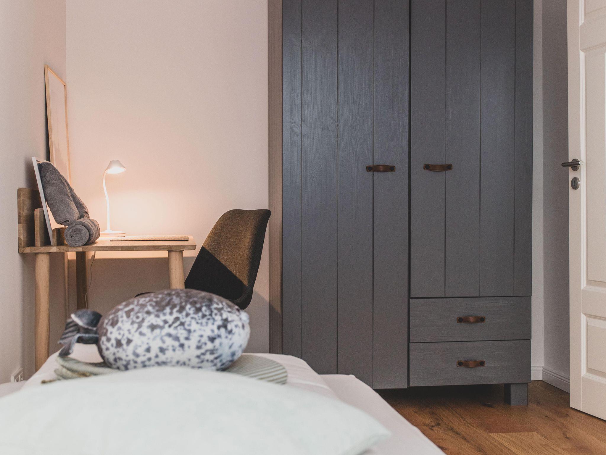 Ein großer Kleiderschrank bietet ausreichend Stauraum.