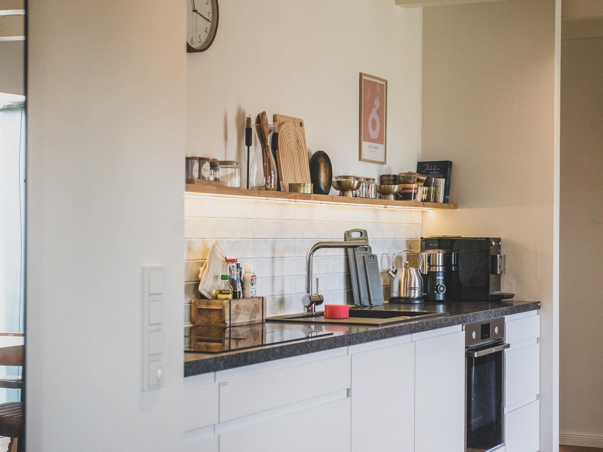 Im Mittelpunkt der Wohnung steht der große Esstisch mit Platz für bis zu 8 Personen – ideal für gemeinsame Mahlzeiten, Spieleabende oder einfach zum gemütlichen Beisammensein. Direkt daneben schließt sich die modern ausgestattete Küche an. Ein freistehender Kühlschrank bietetbesonders viel Stauraum. Dazu sorgen Induktionskochfeld, Geschirrspüler, Kaffee-Vollautomat, Filterkaffeemaschine, Milchaufschäumer, Toaster, Heißluftfritteuse und vieles mehr für höchsten Komfort beim Kochen.