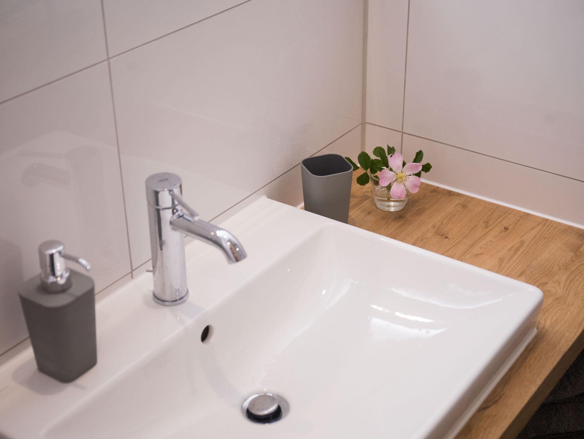 Das moderne Bad im Obergeschoss verfügt über eine bodenebene Dusche, Handtuchheizung und hochwertige Armaturen. Im Erdgeschoss gibt es ein Gäste WC.