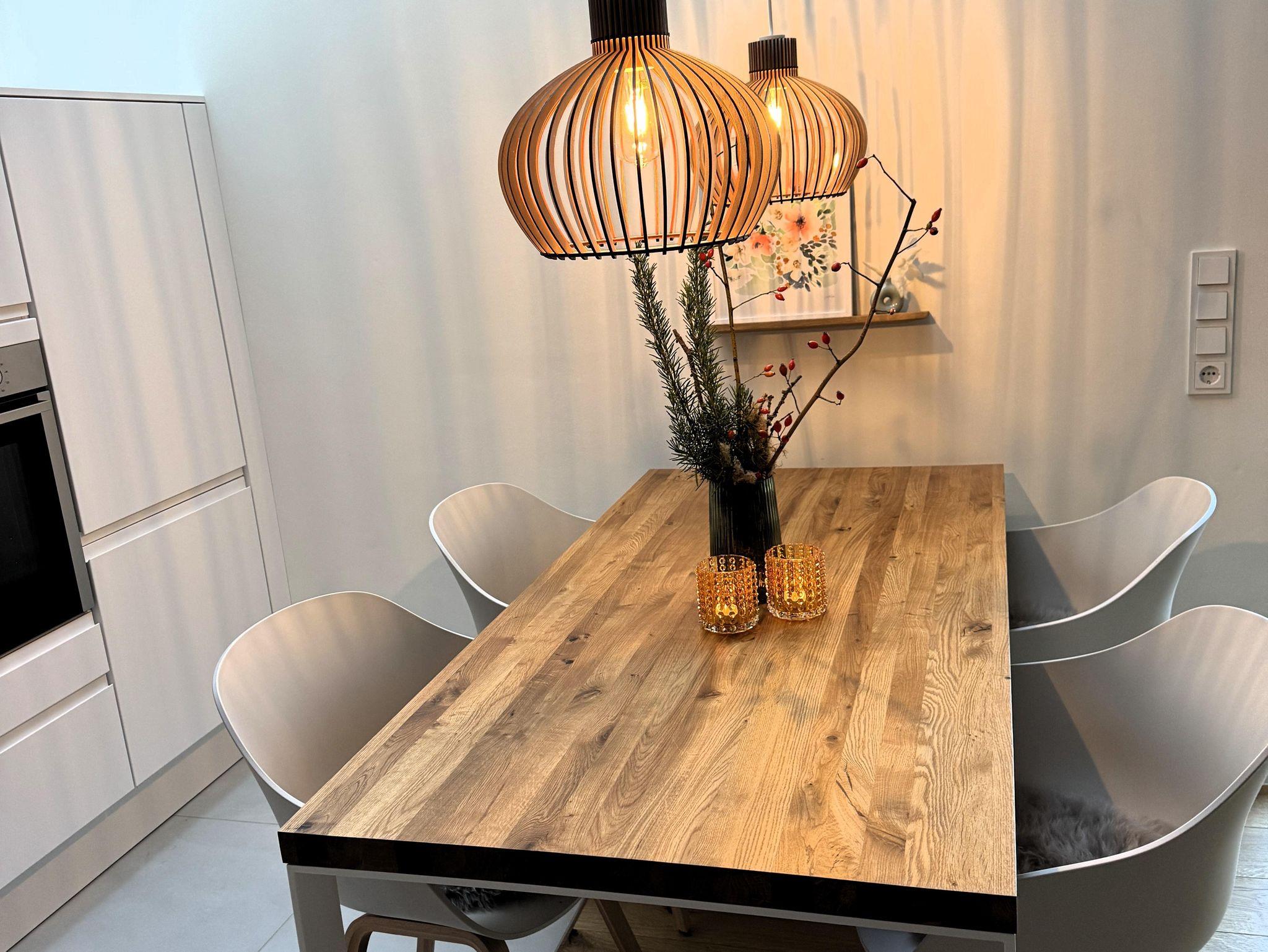 Es erwartet Sie auf 2 Etagen eine moderne und hochwertige Ausstattung mit Echtholzparkett, Fußbodenheizung, Smart-TV, Internetradio (Küche und Bad), Geschirrspüler, Nespresso-Maschine, Toaster, Mikrowelle, WLAN und vielem mehr. Im Erdgeschoss befinden sich neben einem großzügig und mit allen Annehmlichkeiten voll ausgestattetem Küchenbereich ein harmonisch eingerichteter Wohn- und Essbereich. Zudem sind ein Gäste-WC und ein Abstellraum vorhanden. Ein Holz-Laufwagen mit einer Auswahl an Kinderbüchern sowie bunte Duplo- und Legobausteinen stehen unseren jüngsten Urlaubsgästen zur Verfügung.