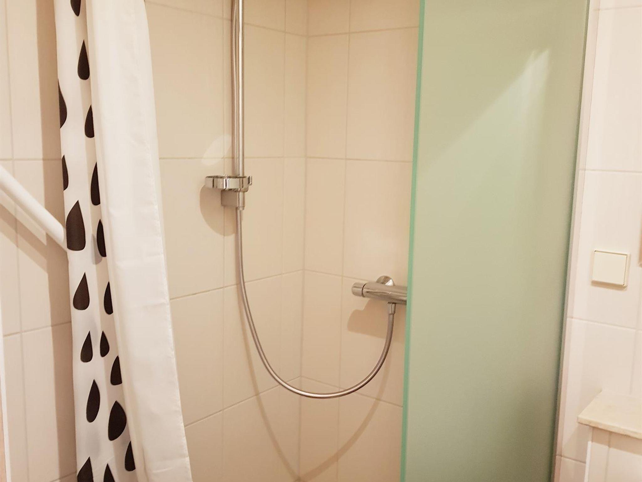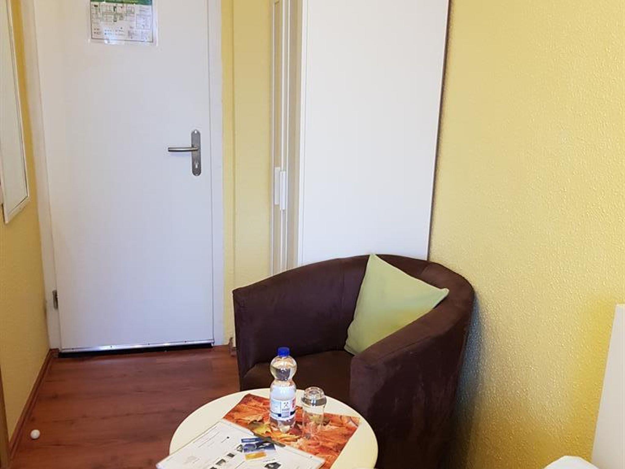 Das größere Einzelzimmer (13 qm; Erdgeschoss; hofseitig - ohne Bahnblick!) verfügt über ein bezogenes Einzelbett (90 cm x 200 cm), einen Schreibtisch mit einer kleinen Flasche Wasser (0,5 l), einen Sessel, eine kleinen Tisch, einen kleinen Kühlschrank, einen Flachbild-TV und ein Bad mit großer Dusche, ein WC, Handtuchheizkörper, Handtücher, Fön, Schminkspiegel, Handseife und Kosmetiktücher.