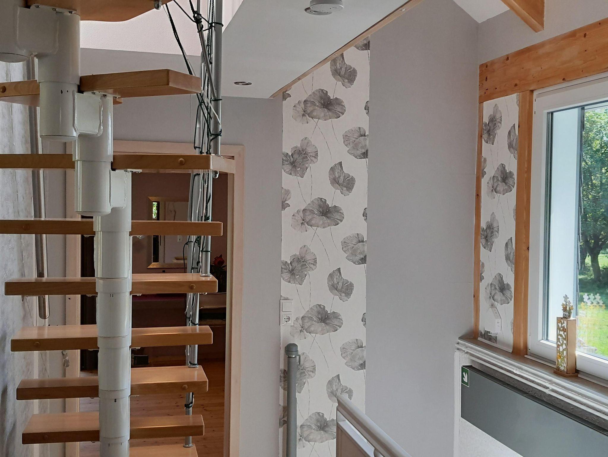 Sie treten ein in eine großzügige und beheizbare Diele, wo Sie auch evtl. verschmutztes Wanderschuhwerk und nasse Kleidung ablegen können. Dies können Sie selbstverständlich im Haus waschen und trocknen! Sie können dort gerne Kinderwagen oder Ausrüstung abstellen. Sie betreten die lichtdurchflutete Maisonettewohnung im Dachgeschoss mit Galerie.