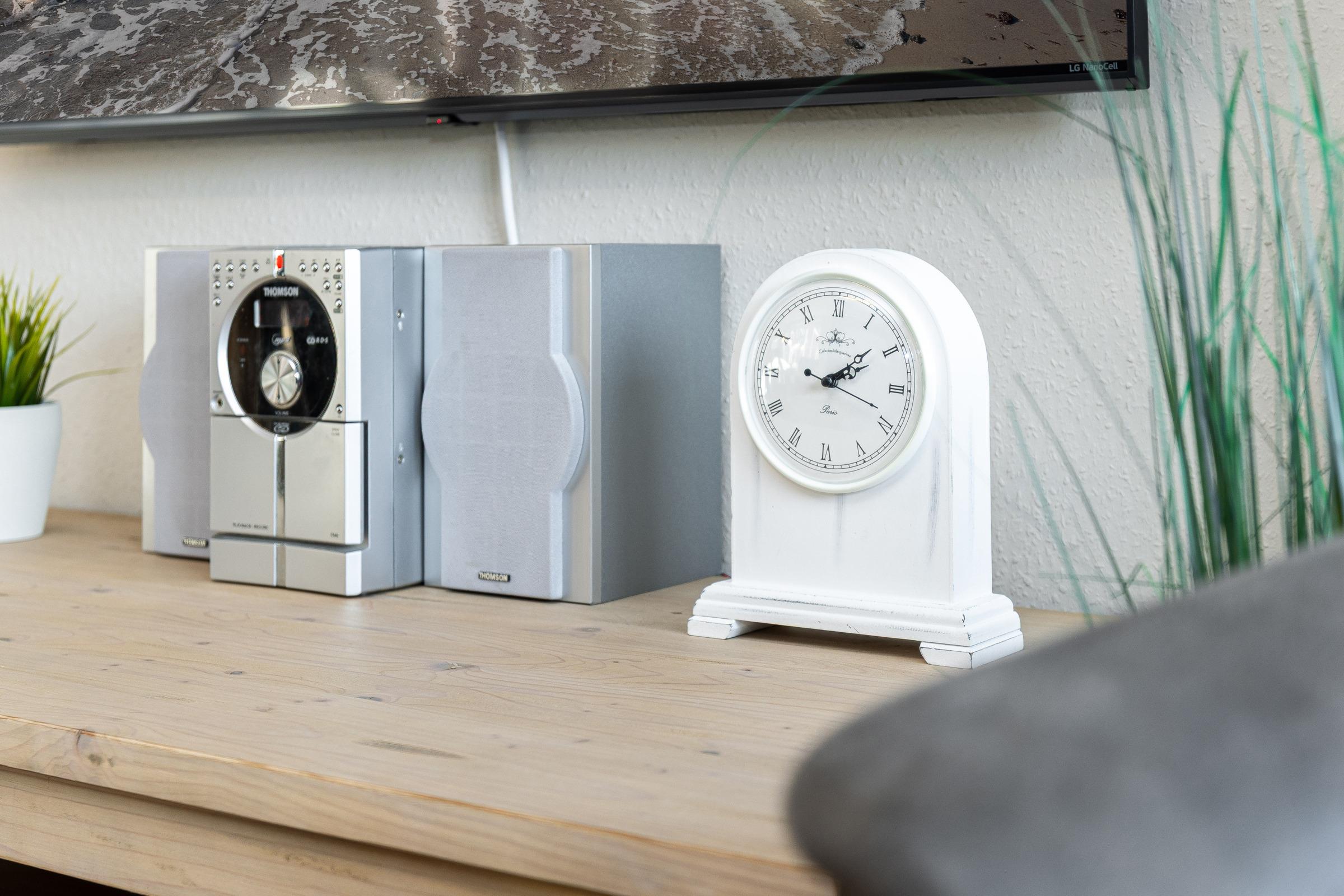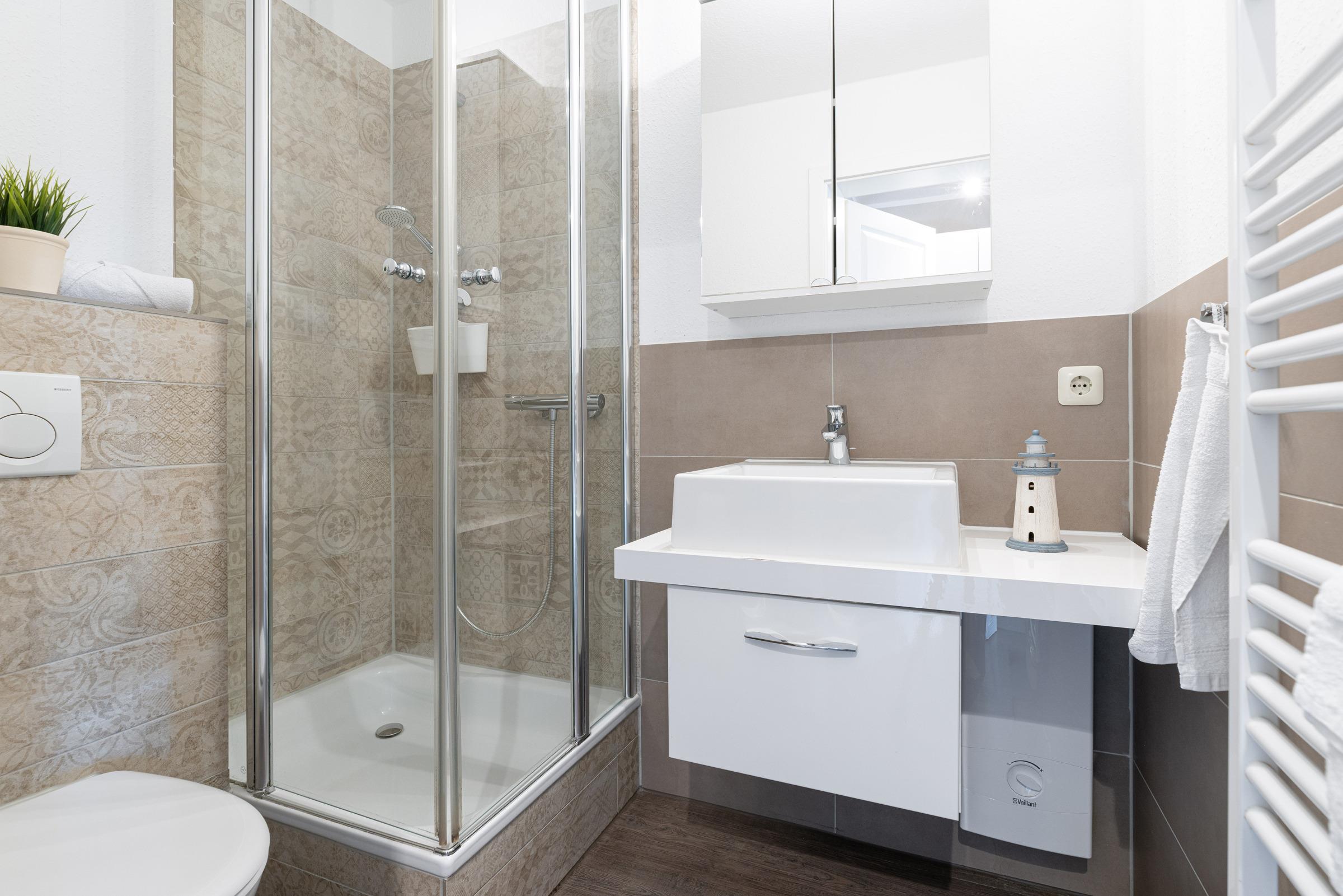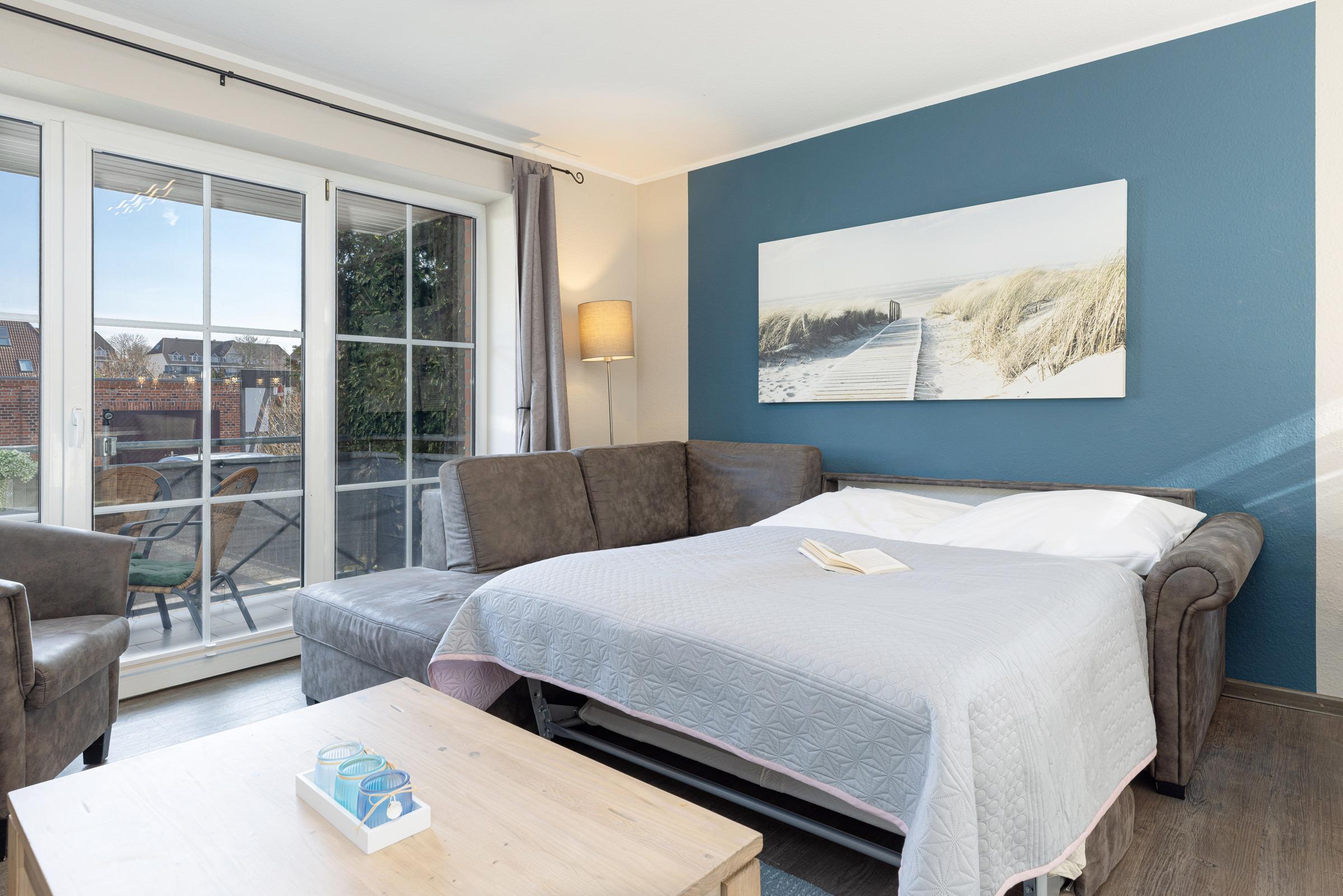 Vom großzügigen Flur gelangen Sie in den geschmackvoll eingerichteten, kombinierten Wohn- Essbereich. Das helle und freundliche Wohnzimmer mit der offenen Wohnküche ermöglicht, einen tollen Urlaub. Die Sofaecke lädt nach langen Strandspaziergängen zum Relaxen ein und wird bei Bedarf mit nur einem Handgriff zu einer komfortablen Schlafmöglichkeit (ca. 140 cm breit). Im Küchenbereich befindet sich eine separate Essecke, die zum gemeinsamen Essen und zu Spieleabende einlädt. Das Schlafzimmer ist nicht sehr groß. Das hochwertige Doppelbett (180x200 cm) reicht von Wand zu Wand und bietet alle Voraussetzungen für einen erholsamen Schlaf. Das Duschbad ist hell, freundlich und frisch gestaltet. Strand, Schwimmhalle, Hafen, Marine-Ehrenmal, U-Boot und das Ortszentrum sind in wenigen Minuten zu Fuß erreichbar.