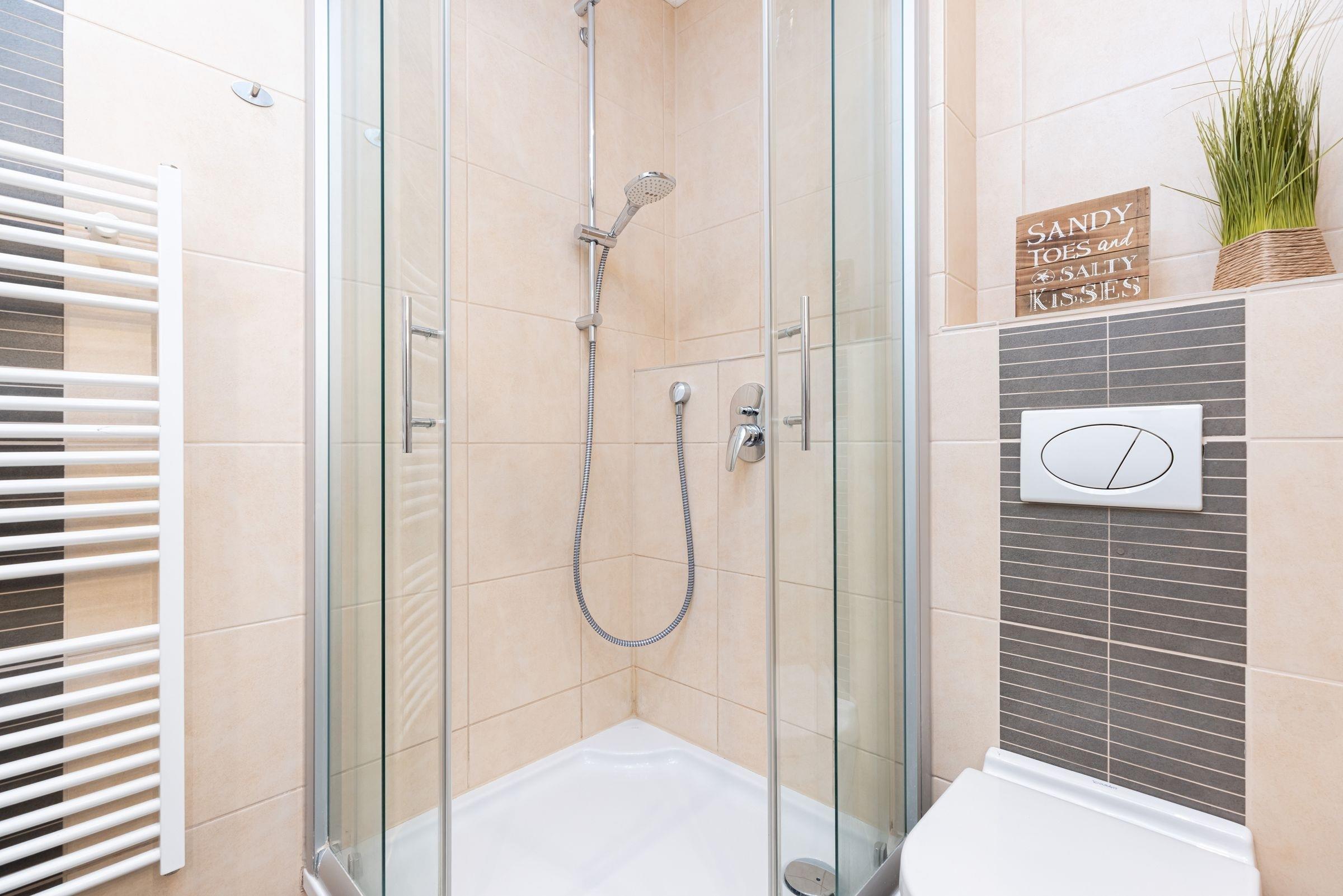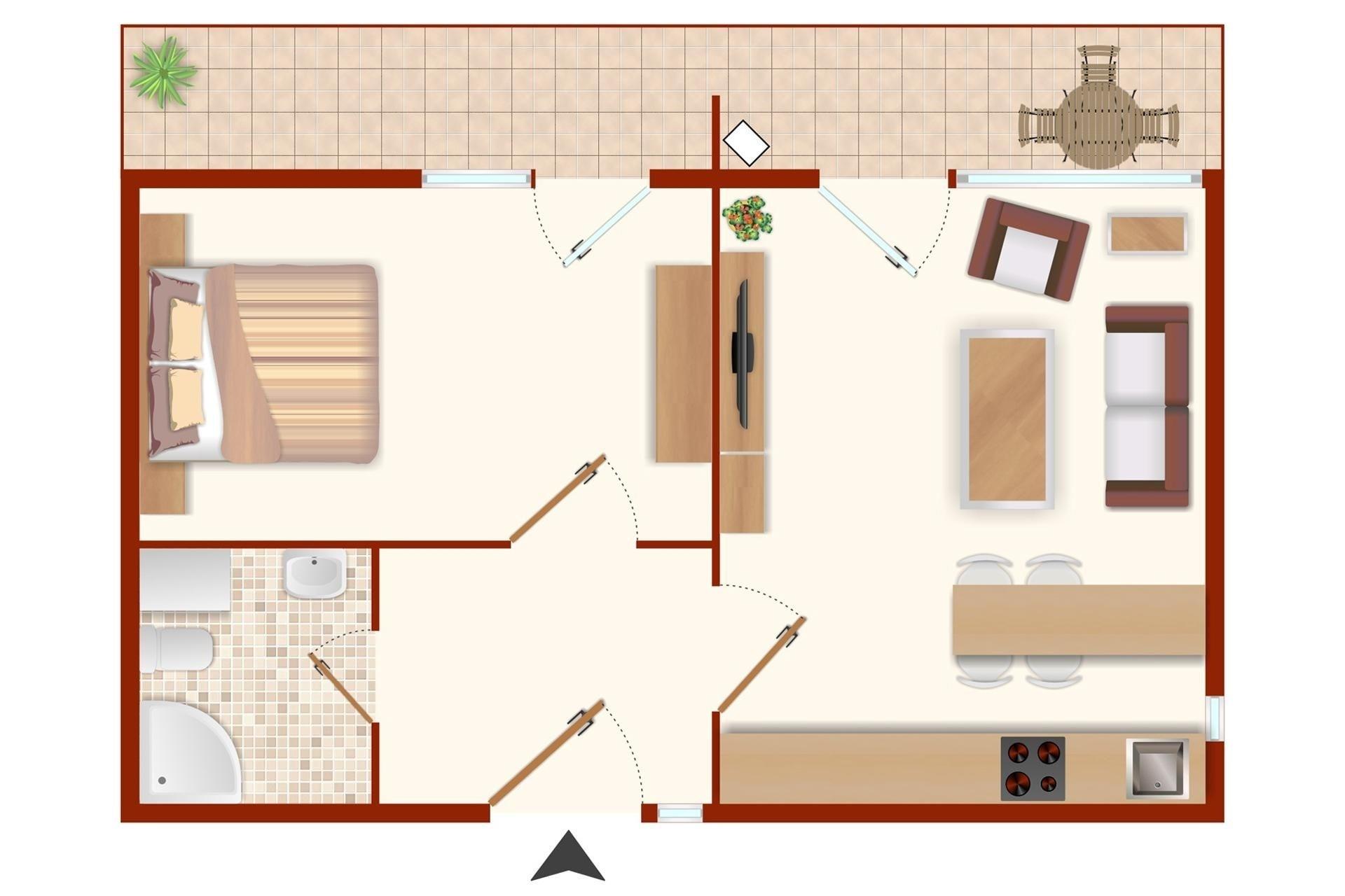 Der modern eingerichtete, kombinierte Wohn/Schlafbereich verfügt über eine gut ausgestattete Küchenzeile, einen Essbereich für 4 Personen und eine Couch, die mit wenigen Handgriffen einen Schlafplatz für 2 Personen verwandelt werden kann. Darüber hinaus steht Ihnen ein separates Schlafzimmer mit Doppelbett und Kleiderschrank zur Verfügung sowie auch ein helles und freundliches Duschbad.