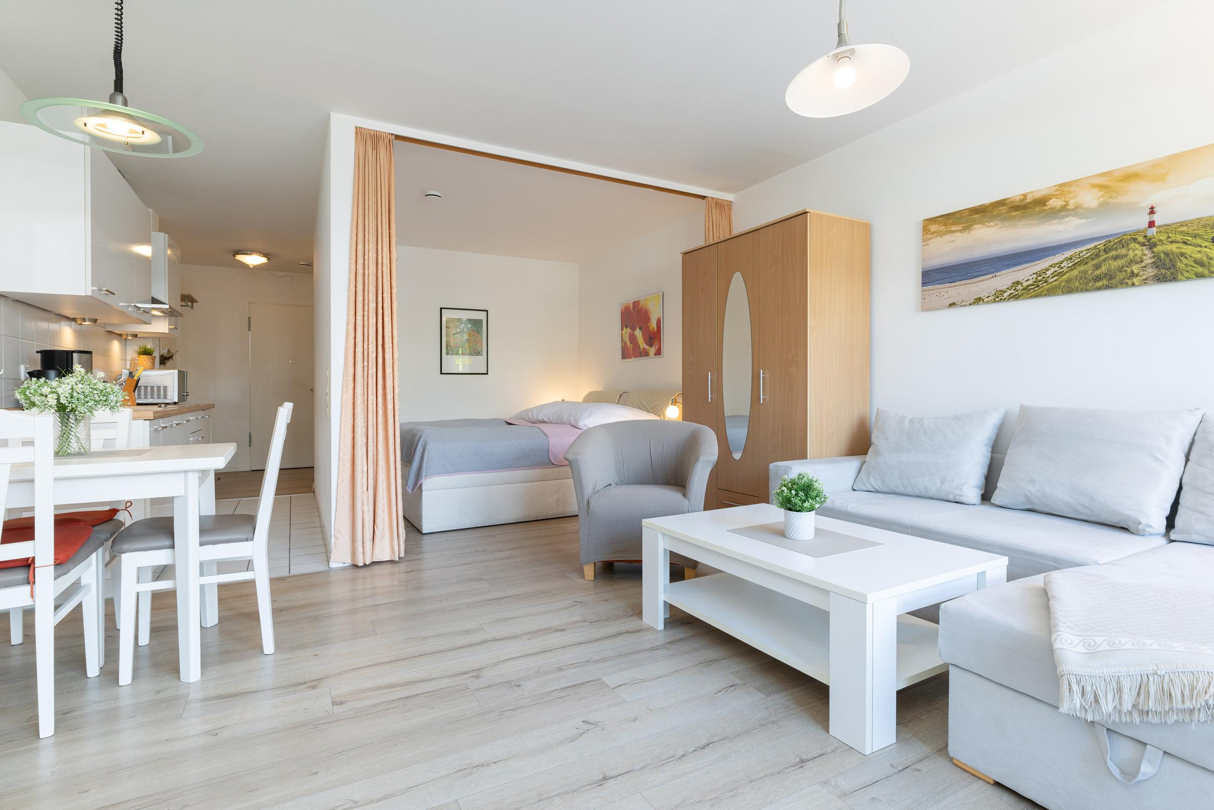 Die Wohnung ist hell und freundlich eingerichtet. Das Appartement verfügt über eine kleine Küchenzeile mit Induktionsherd, einem Essplatz sowie einer Schlafcouch und Doppelbett (180x200cm). Vom Balkon genießen Sie an lauen Sommerabenden und einem Gläschen Wein die etwas eingeschränkte Seesicht.