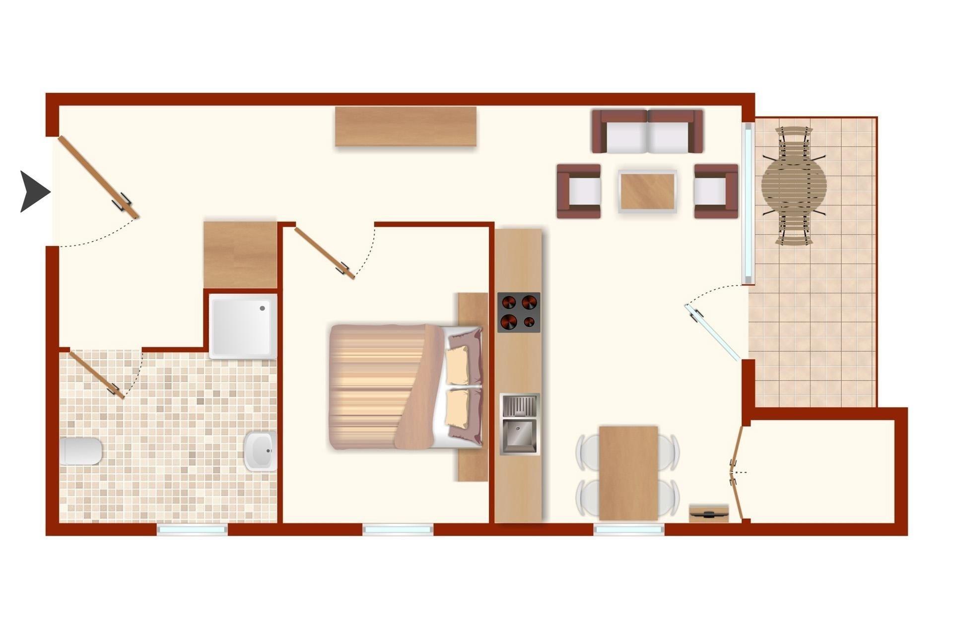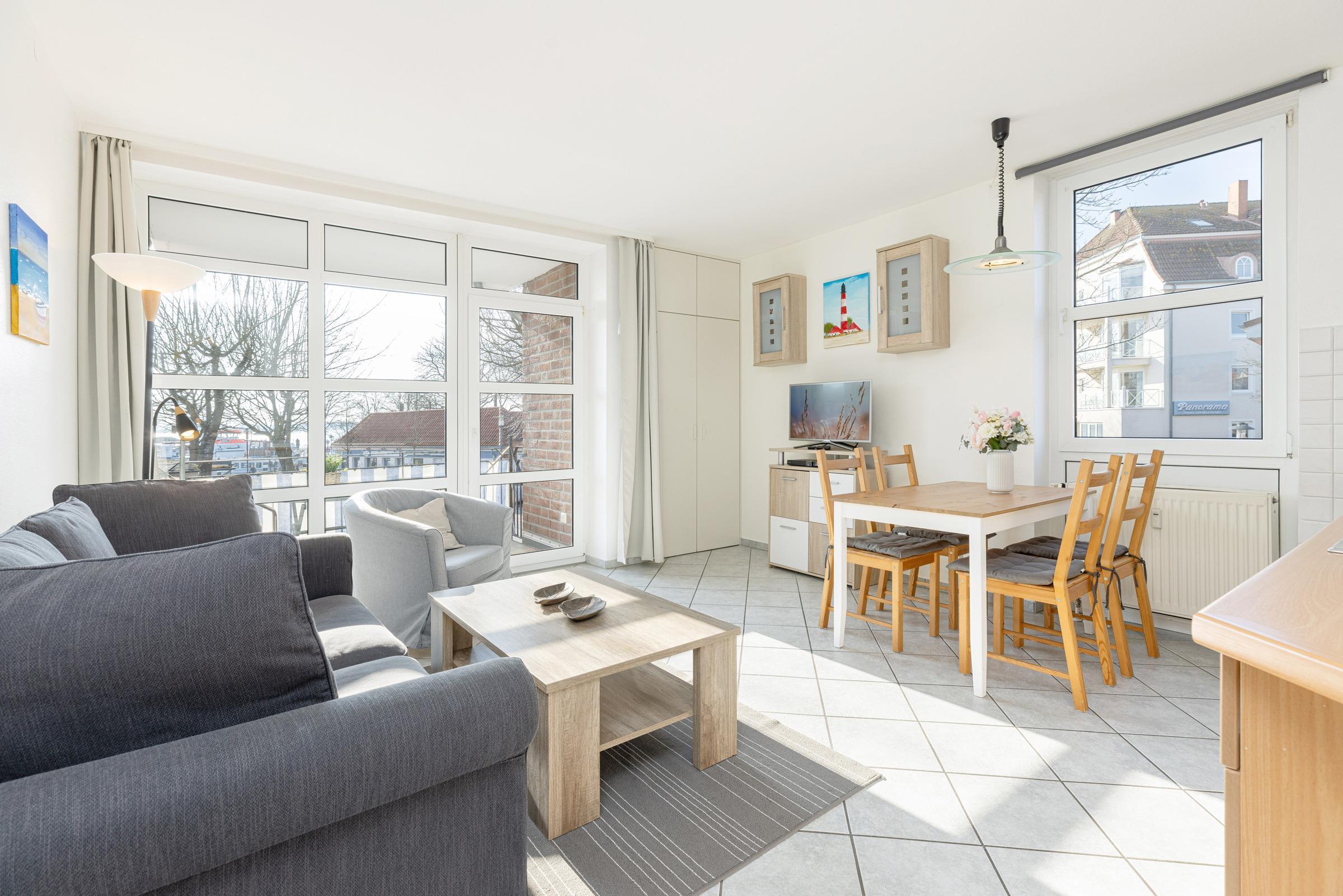 Ein separates Schlafzimmer mit Doppelbett (180x200 cm) und ausreichend Ablagemöglichkeiten stehen neben einem großzügigen Badezimmer mit Dusche/WC und einem kombinierten Wohn-Schlafraum mit Schlafcouch (140x200 cm) mit Küchenzeile zur Verfügung. Der morgendliche Kaffee oder das Frühstück kann entspannt auf dem Balkon mit Blickrichtung Hafen genossen werden. Ein Sonnenschirm spendet wohligen Schatten.