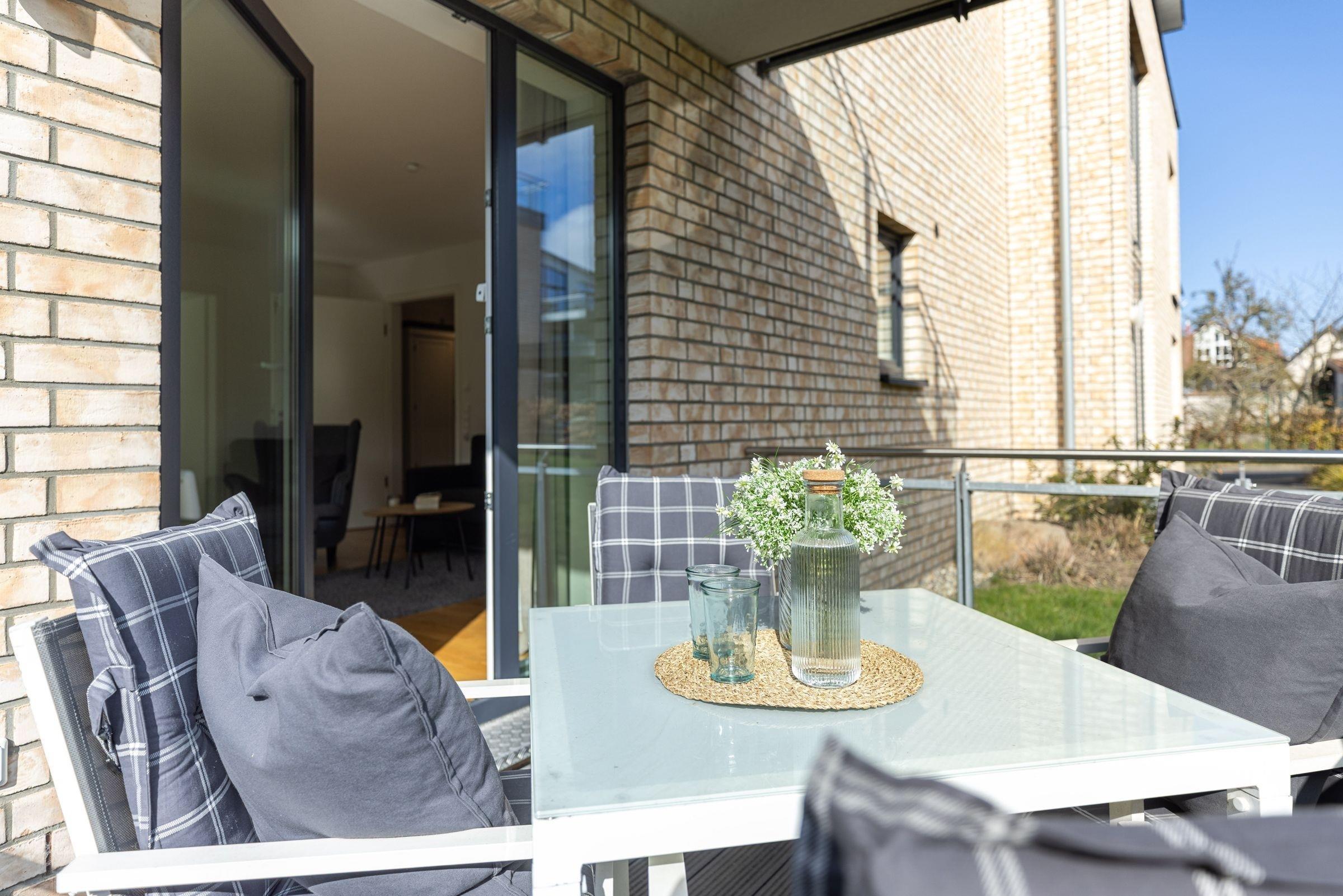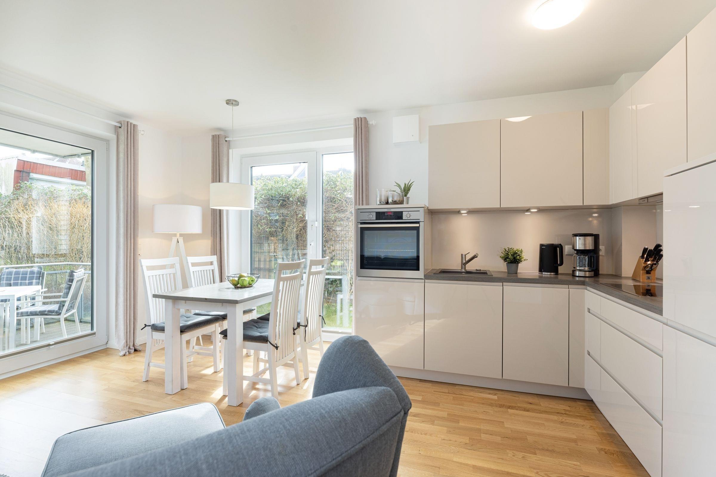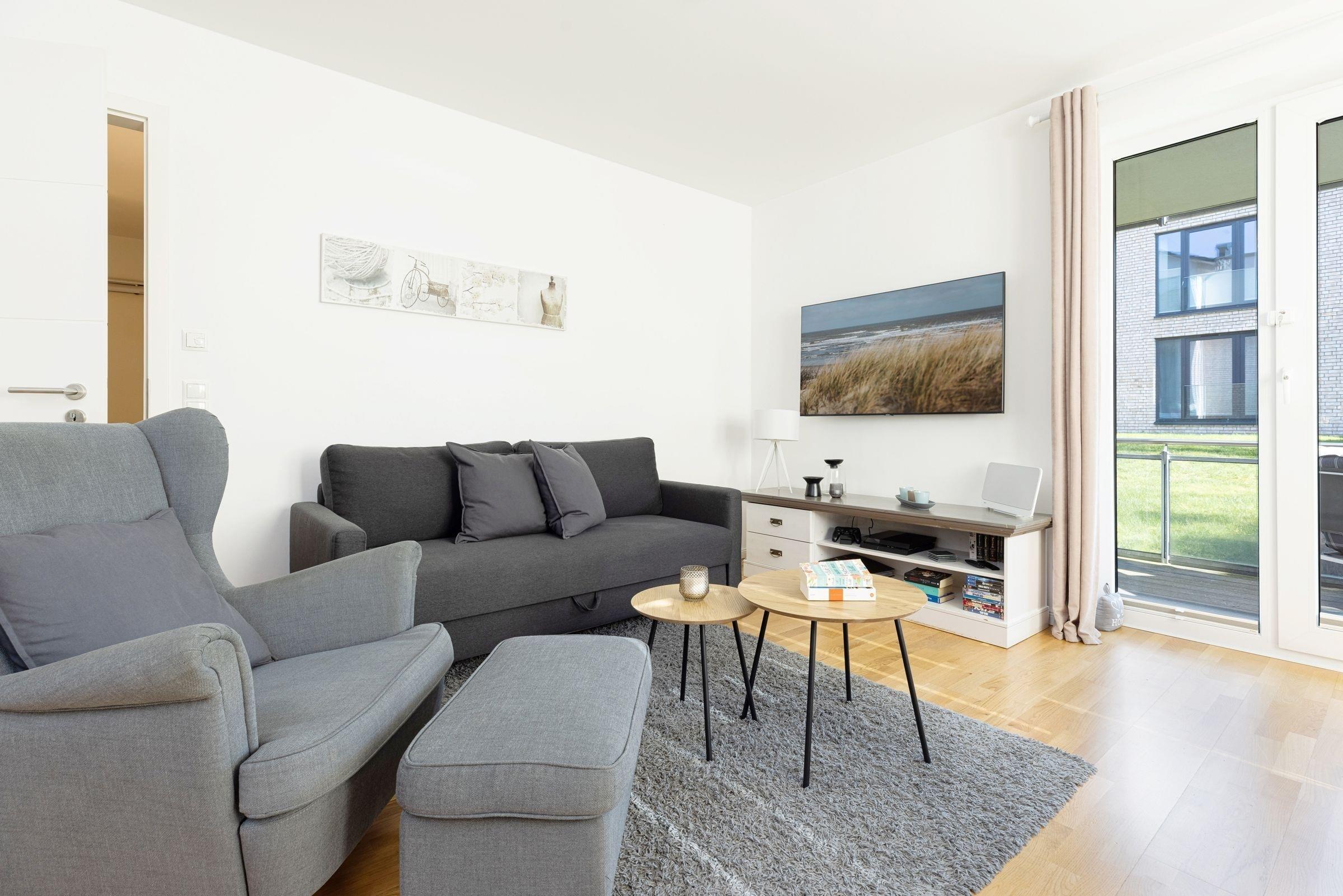 Die Wohnung empfängt Sie mit einem praktischen Flur. Das frisch-nordisch eingerichtete Wohnzimmer ist mit einer offenen Wohnküche ausgestattet. Auch die Möblierung des Wohnbereichs ist harmonisch aufeinander abgestimmt. Der Tisch lädt nicht nur zum gemeinsamen Essen ein, sondern ist wie gemacht für lange Abende in guter Gesellschaft. Das Sofa bietet nach ausgedehnten Strandspaziergängen ein angenehmes Plätzchen zum Relaxen. Für gemütliche Fernsehabende sorgt ein 50-Flatscreen mit Pay-TV. Neben dem Kabel-Fernseher sorgen die Stereoanlage, der DVD-Blu-Ray-Player und eine Playstation 4 für Abwechslung. Bei Nacht wird das 160x200 cm breite Sofa zur Schlafstatt für entweder zwei Kinder oder einen Erwachsenen. Die Küchenzeile ist modern gestaltet und dürfte keine kulinarischen Wünsche offen lassen. Ein Induktionsherd macht einfach nur Spaß, das Gefrierfach erleichtert den Einkauf und die Spülmaschine das Leben. Ein hochwertiger Backofen in bedienerfreundlicher Höhe ist ebenfalls vorhanden. Mit der Nespresso-Maschine können Sie sich z.B. einen leckeren Espresso nach dem Essen zubereiten. Vom Wohnzimmer gelangen Sie auf die schön ausgestattete Terrasse. Nordisches Ambiente auch hier, dank des Holzbodens. Im Sommer spendet dieser, nackten Füßen wohlige Wärme beim ersten Kaffee am Morgen. Und abends lässt sich nach ereignisreichen Ferientagen ein guter Tropfen wunderbar genießen. Das Schlafzimmer ist mit einem Doppelbett und einem weiteren Schrank für Ihre Garderobe versehen. Auch hier wurde an einen weiteren 43-Flat-TV gedacht. Das Duschbad ist hell, freundlich und modern ausgestattet.