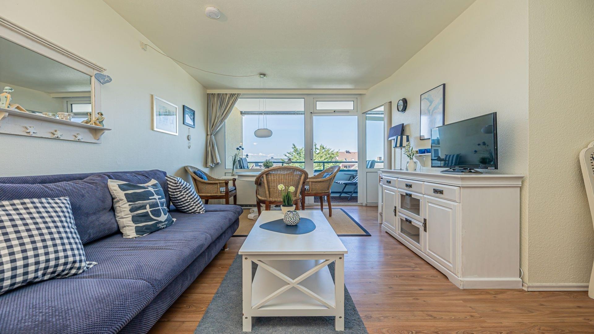 In der maritim eingerichteten Wohnung gibt es eine Küche, ein Bad mit Dusche und WC, einen kombinierten Wohn-/Schlafraum mit Essecke und Schlafsofa (160x200 cm) plus TV sowie einen separaten Schlafraum mit 2 hochwertigen Einzelbetten und TV. Im modernisierten Badezimmer steht Ihnen neben einer fast ebenerdigen Dusche mit Duschhocker eine Waschmaschine zur Verfügung. Vom Balkon aus können Sie bei einer Tasse Kaffee sogar einen kleinen Blick auf die Ostsee erhaschen.