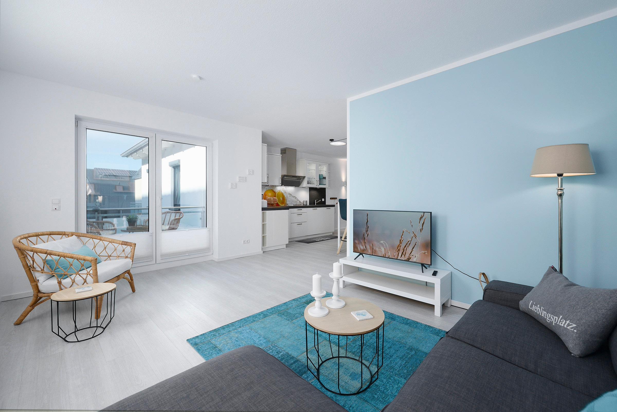 Der stilvoll eingerichtete Wohnbereich verfügt über eine gemütliche Sofaecke, TV, sowie Zugang zu beiden Balkonen mit Gartenmöbeln – hier genießen Sie zu jeder Tageszeit sonnige Stunden mit Blick Richtung Meer.
