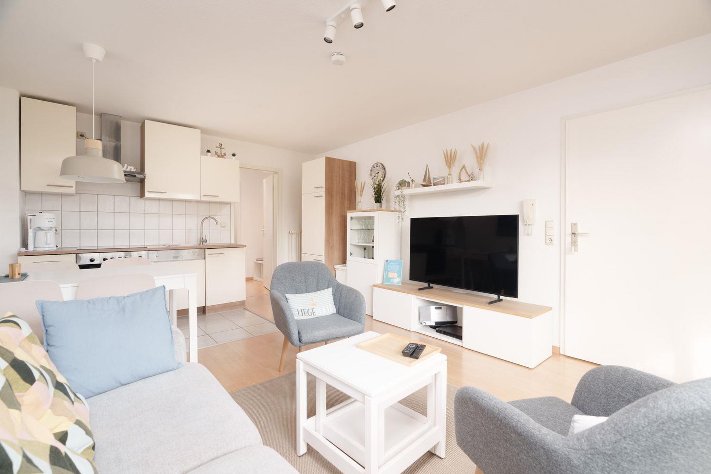 Der offene Wohnbereich schafft mit seiner hellen, freundlichen Gestaltung eine entspannte Stimmung. Das große Sofa lädt zum Zurücklehnen ein – ob mit einem guten Buch, beim gemeinsamen Filmabend oder einfach zum Durchatmen nach einem langen Tag am Meer. Der angrenzende Essplatz bietet Raum für gesellige Runden, während die offene Küche mit Cerankochfeld, Backofen, Geschirrspüler und allen wichtigen Kochutensilien zum unkomplizierten Kochen einlädt – ganz wie zu Hause, nur mit Meer in der Luft.